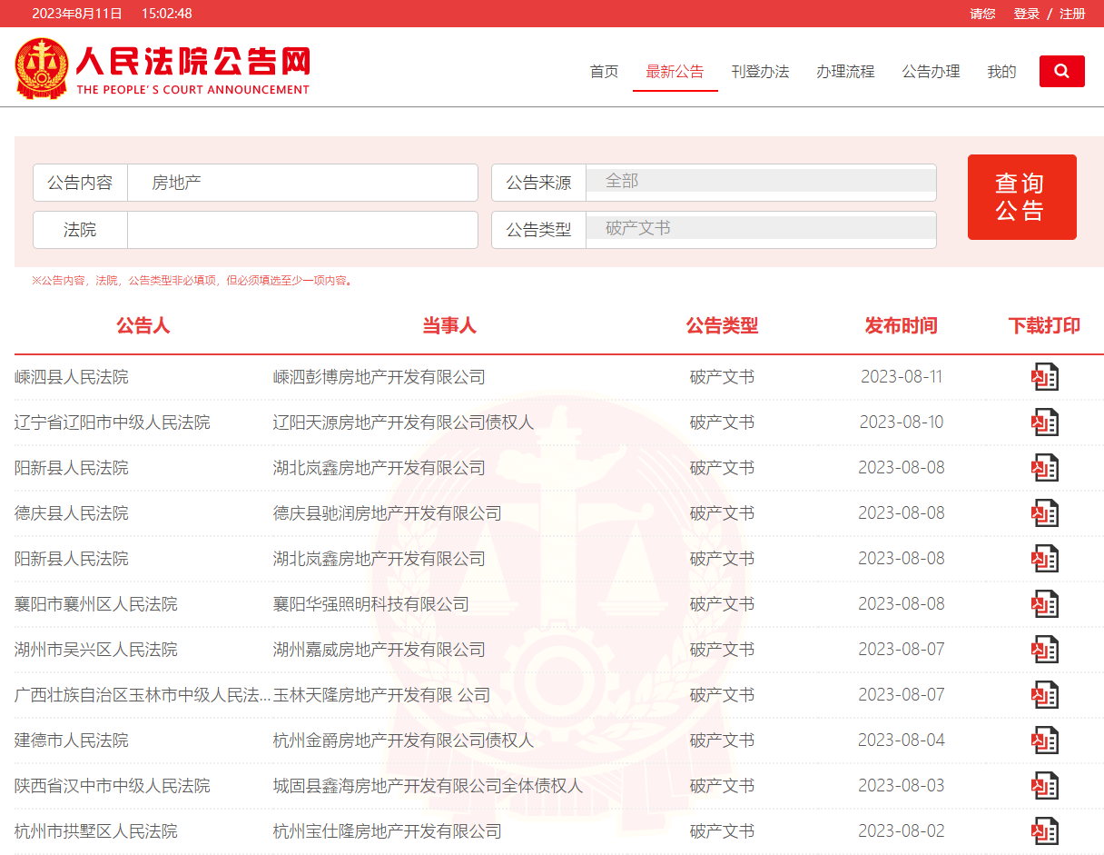 據(jù)人民法院公告網(wǎng)數(shù)據(jù),2023年以來截至發(fā)稿,已有175家房地產(chǎn)相關企業(yè)發(fā)布了破產(chǎn)公告。有的因為無法清償?shù)狡趥鶆?,有的負債過高,有的資金鏈斷裂,最終紛紛申請破產(chǎn)清算,名下房產(chǎn)、土地慘遭處理。
