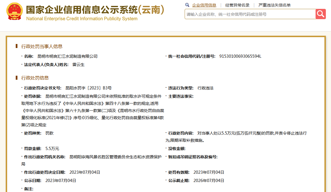 另外,根據(jù)國(guó)家企業(yè)信用信息公示系統(tǒng)公開(kāi)信息顯示,昆明市明良匯江水泥制造有限公司未依照批準(zhǔn)的取水許可規(guī)定條件取用地下水,被昆明陽(yáng)宗海風(fēng)景名勝區(qū)管理委員會(huì)生態(tài)和水資源保護(hù)局處罰。
