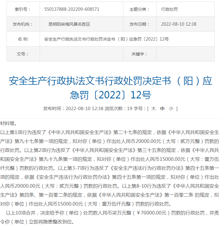 2022年8月10日,昆明陽(yáng)宗海風(fēng)景名勝區(qū)管理委員會(huì)發(fā)布《安全生產(chǎn)行政執(zhí)法文書(shū)行政處罰決定書(shū)(陽(yáng))應(yīng)急罰〔2022〕12號(hào)》稱(chēng):昆明市明良匯江水泥制造有限公司大馬山石灰?guī)r礦在生產(chǎn)過(guò)程中存在未配備注冊(cè)安全工程師、采礦技術(shù)員,礦山+1980m水平臺(tái)階存在凹陷,該區(qū)域未設(shè)置警示標(biāo)識(shí),礦山未編制挖掘機(jī)、裝載機(jī)、推土機(jī)操作規(guī)程等違法違規(guī)行為,昆明陽(yáng)宗海風(fēng)景名勝區(qū)管理委員會(huì)對(duì)該水泥廠作出7萬(wàn)元處罰。