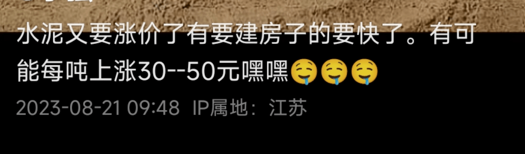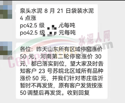 據(jù)市場(chǎng)反饋,8月20日棗莊中聯(lián)、華沃已上調(diào)報(bào)價(jià)30元/噸;21日濟(jì)寧海螺上調(diào)30元/噸。22日-23日蘇北徐州中聯(lián)水泥、龍山水泥將上調(diào)報(bào)價(jià)。江蘇徐州一經(jīng)銷商通知稱,水泥又要漲價(jià)了,有建房子要快下手了,預(yù)計(jì)上漲30~50元/噸。