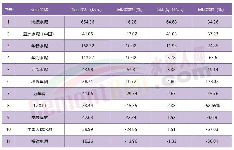 海螺水泥、亞洲水泥、華新水泥、華潤(rùn)水泥、西部水泥、萬(wàn)年青寧、祁連山、寧夏建材、天瑞水泥等9家企業(yè)凈利潤(rùn)等均有不同程度的下滑;福建水泥虧損1.33億。