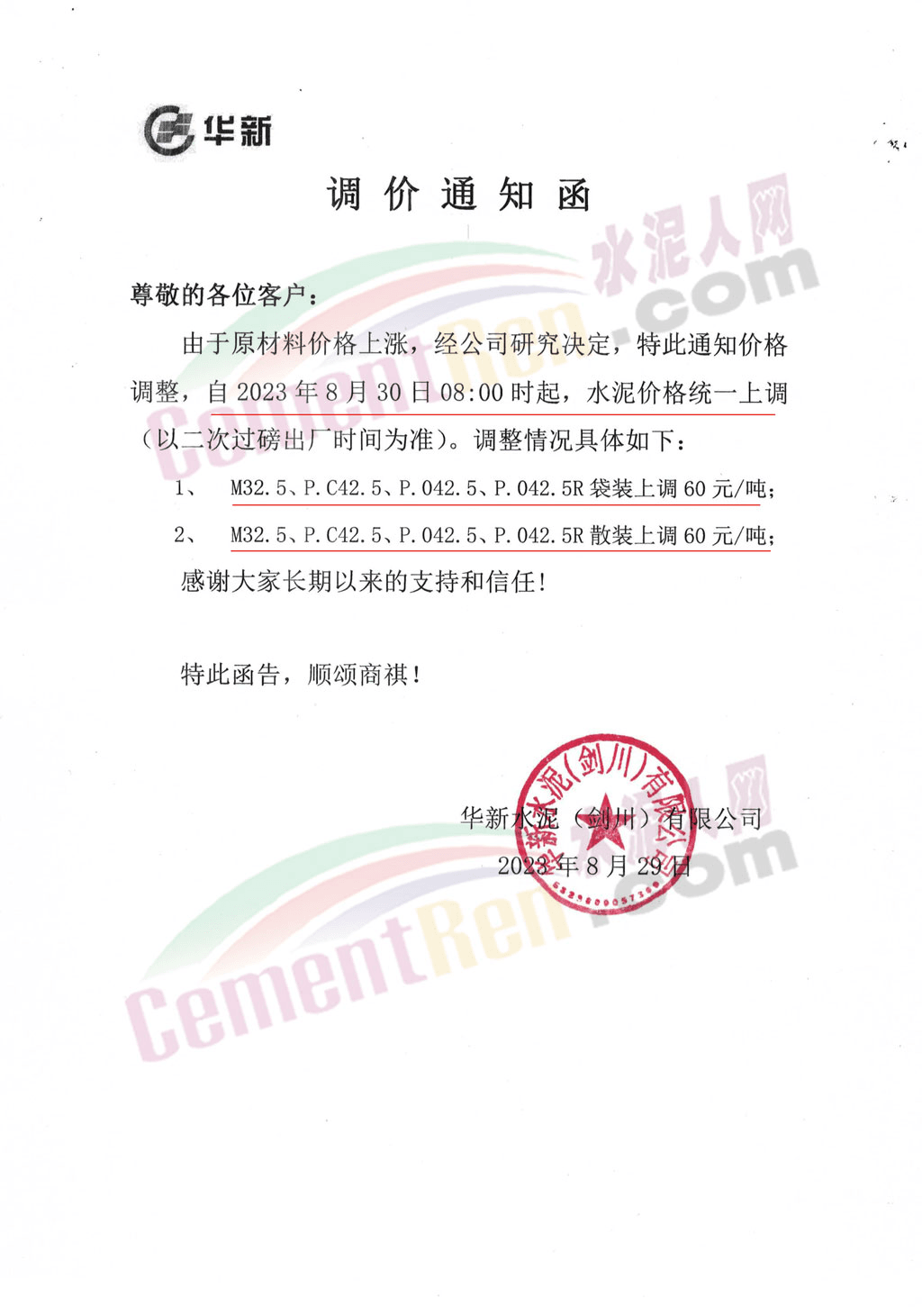華新水泥(劍川)有限公司通知,由于原材料價(jià)格上漲,經(jīng)公司研究決定,特此通知價(jià)格調(diào)整,自2023年8月30日8時(shí)起,水泥價(jià)格統(tǒng)一上調(diào)。M32.5、P.C42.5、P.O42.5、P.O42.5R袋裝/散裝同步上調(diào)60元/噸。