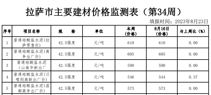 據(jù)來自西藏自治區(qū)發(fā)展和改革委員會(huì)價(jià)格監(jiān)測中心的數(shù)據(jù)顯示,2023年8月23日西藏拉薩市場42.5強(qiáng)度水泥零售報(bào)價(jià)610元/噸,高爭、華新出廠價(jià)在546-605元/噸不等。