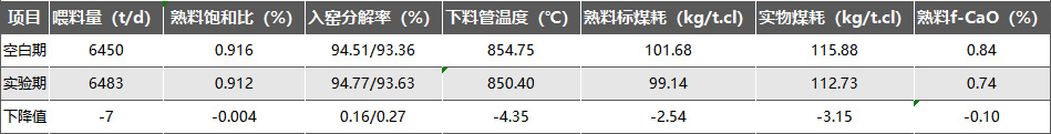 空白期與試驗(yàn)期回轉(zhuǎn)窯主要參數(shù)對(duì)比如上表所示,加入生料助磨劑后,控制窯產(chǎn)量、f-CaO基本不變的情況下,下調(diào)入窯生料溫度控制值,入窯生料分解率仍能滿足生產(chǎn)需求,相比空白期小幅增加,熟料實(shí)物煤耗下降3.15kg/t.cl,考慮到煤質(zhì)變化影響,折算標(biāo)煤耗下降約2.54kg/t.cl,節(jié)煤效果達(dá)到預(yù)期。