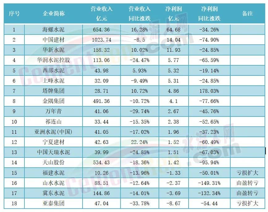 此外,還有不少企業(yè)出現(xiàn)虧損。冀東水泥營收實現(xiàn)144.86億元,同比下降14.01%;歸母凈利潤-3.69億元,同比下降132.34%。