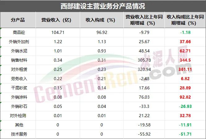 今年上半年,西部建設(shè)仍以預(yù)拌混凝土生產(chǎn)為核心,輻射水泥、外加劑、商品砂漿、砂石骨料、物流運(yùn)輸、技術(shù)研發(fā)與服務(wù)、檢測、資源綜合利用、電子商務(wù)等業(yè)務(wù),基本建立了“技術(shù)研發(fā)+資源儲(chǔ)備+生產(chǎn)+銷售+服務(wù)”的產(chǎn)業(yè)鏈條。同時(shí),外銷外加劑、外銷水泥、銷售材料、對外租賃等業(yè)務(wù)板塊營業(yè)收入及收入構(gòu)成同比去年均有所增長。