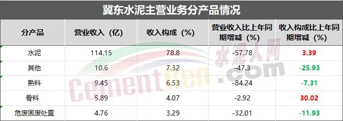 今年上半年,冀東水泥各產(chǎn)品業(yè)務(wù)營業(yè)收入同比去年均有所減少,但水泥和骨料營收收入占比同比去年有所增加,其中,骨料營收收入占比同比去年增加30.02%。據(jù)水泥人網(wǎng)了解,冀東水泥主要業(yè)務(wù)及產(chǎn)能公司及子公司的主要業(yè)務(wù)為硅酸鹽水泥、熟料及相關(guān)建材產(chǎn)品的制造和銷售,同時(shí)涵蓋砂石骨料、危固廢處置、外加劑等產(chǎn)業(yè)(業(yè)務(wù))。