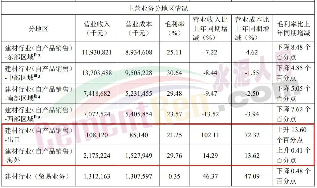 值得一提的是,在國內(nèi)各區(qū)域毛利率均有所下滑的背景下,海螺水泥出口及海外業(yè)務毛利率實現(xiàn)逆勢增長,其中出口營收同比增長102.11%,建材行業(yè)海外營收增長14.29%,毛利率分別同比增長13.6%和0.41%。