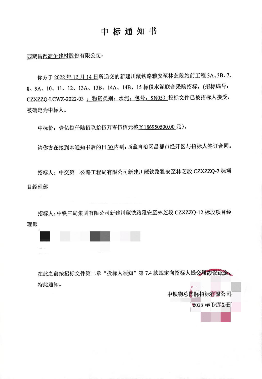 最終,在黨委書記、董事長和領(lǐng)導(dǎo)班子的正確決策、大力支持和各部門的精誠團結(jié)、全力配合之下,昌都高爭憑借扎實的服務(wù)態(tài)度和良好的社會信譽在激烈的競爭中脫穎而出,順利中標川藏鐵路雅安至林芝段工程水泥采購項目,成功獲得水泥供應(yīng)權(quán),中標量28萬噸,中標金額約1.87億元。