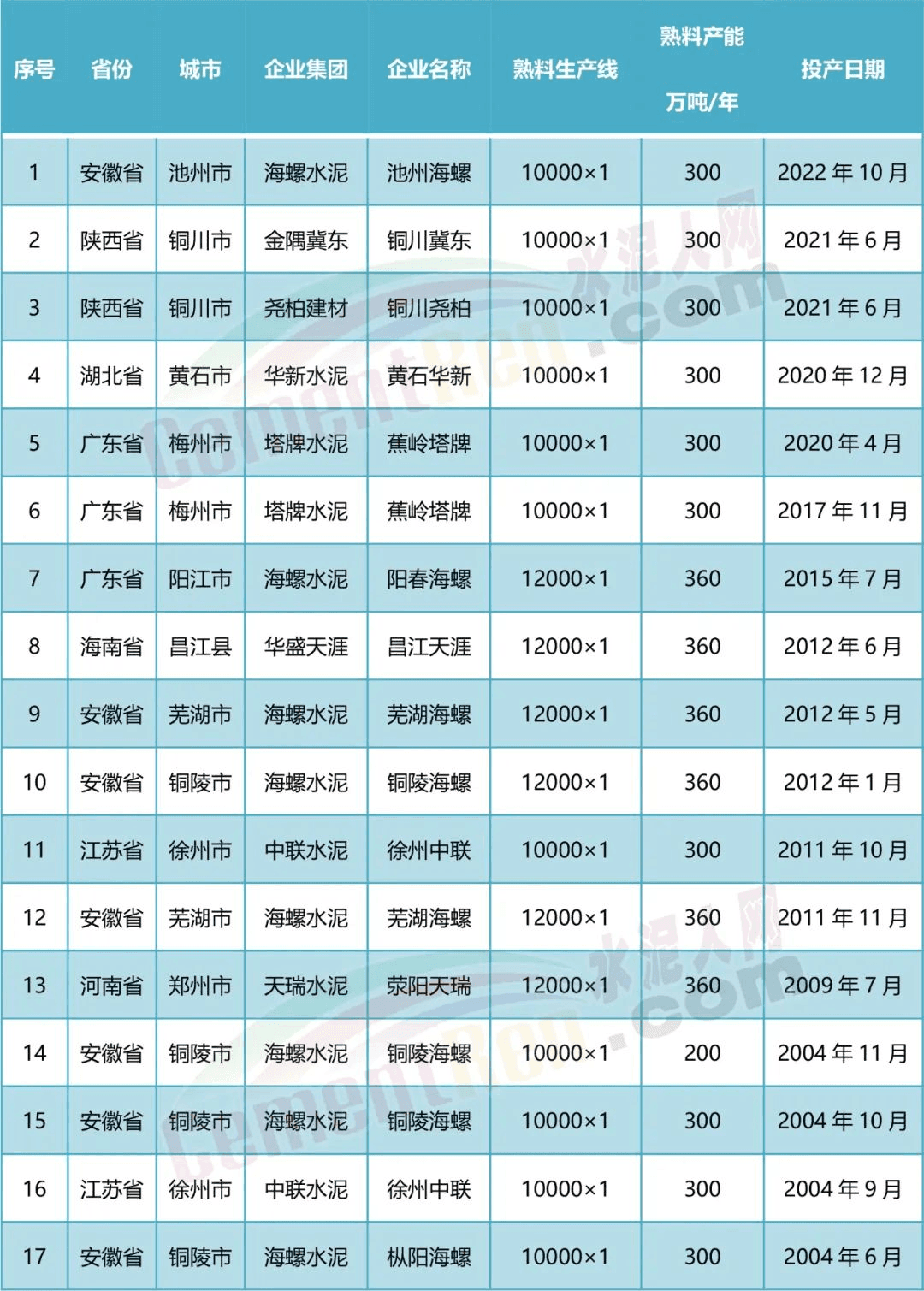 目前國內(nèi)已建成投產(chǎn)10000t/d及以上生產(chǎn)線共17條,其中包含陜西銅川市惠塬工業(yè)園2021年6月新投產(chǎn)的冀東水泥和堯柏水泥的兩條萬噸線以及2022年10月建成投產(chǎn)的池州海螺10000t/d生產(chǎn)線。