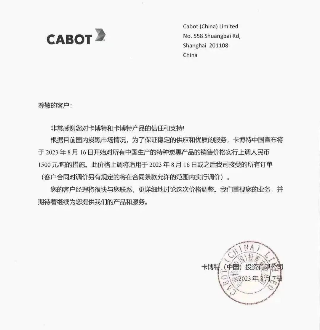 8月份開始,炭黑價格觸底反彈。目前橡膠用炭黑價格已經(jīng)突破一萬大關(guān),且還呈現(xiàn)往上飆升的態(tài)勢。2023年9月15日炭黑價格為11000元/噸左右,并且還有繼續(xù)上漲之勢。炭黑龍頭卡博特宣布對所有中國生產(chǎn)的特種炭黑產(chǎn)品的銷售價格實行上調(diào)人民幣1500元/噸。