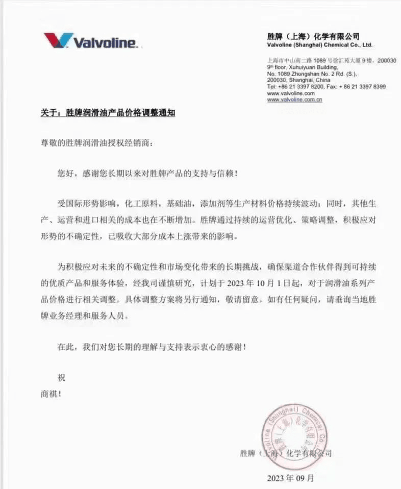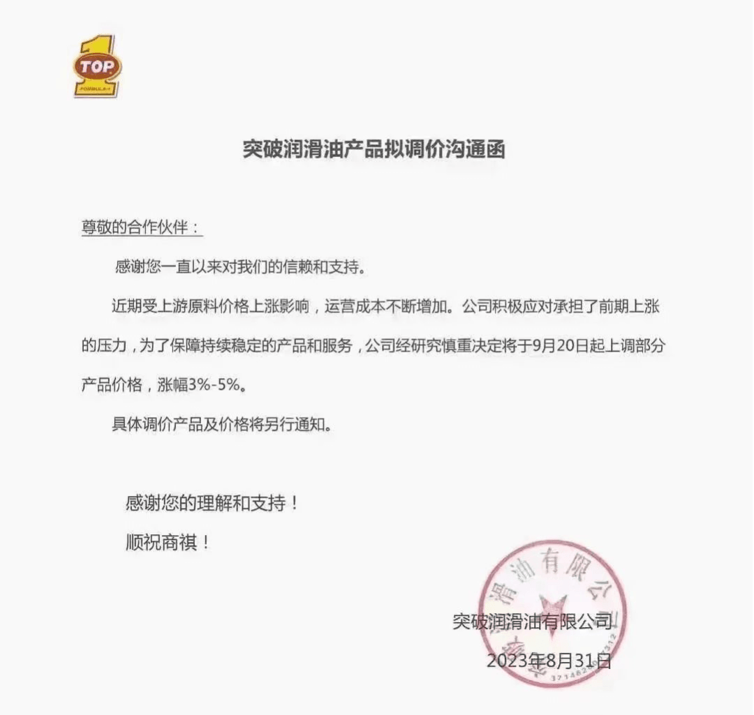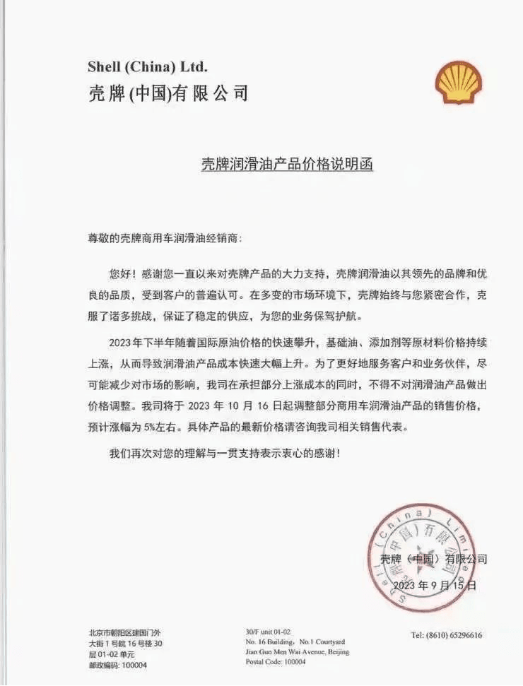 近日,勝牌、殼牌和突破潤滑油發(fā)布了關(guān)于調(diào)整潤滑油產(chǎn)品價格通告,宣布對產(chǎn)品價格進行適度上調(diào),預(yù)計漲幅為5%左右。