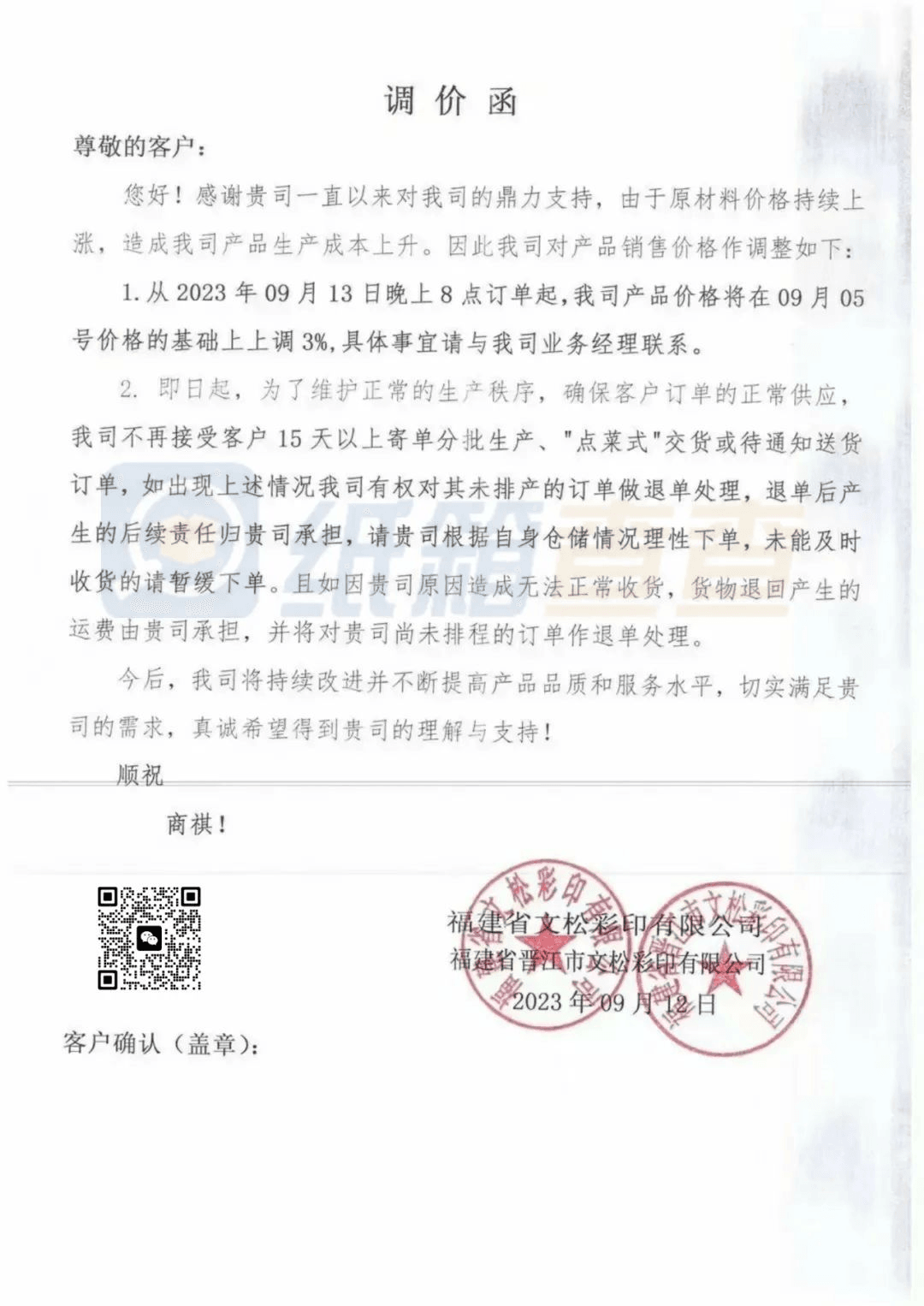 福建省文松彩印:從9月13日晚上8點訂單起,再上調(diào)3%。