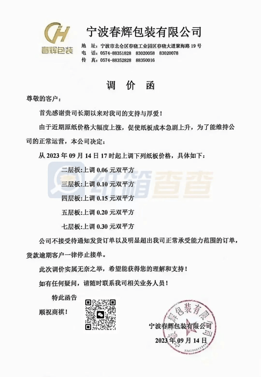 寧波春輝包裝:從2023年9月14日17時起,具體如下:二層板:上調(diào)0.06元雙平方;三層板:上調(diào)0.10元雙平方四層板:上調(diào)0.15元雙平方五層板:上調(diào)0.20元雙平方;七層板:上調(diào)0.30元雙平方。