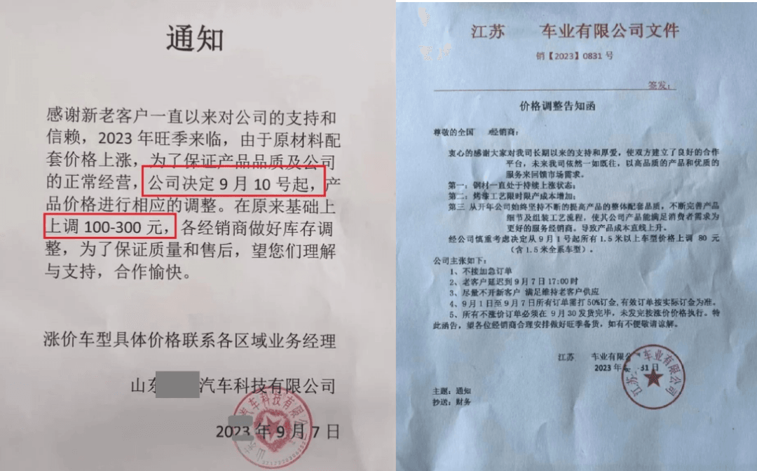 多個整車廠家自9月10日起,在8月份上調(diào)基礎(chǔ)上價格再次上調(diào),兩輪車、三輪車、四輪車或?qū)⒂瓉韼资綆装僭坏鹊臐q價幅度,各三輪車、篷車、微電轎車型漲價幅度在120——300元不等,目前漲價潮已蔓延至全國市場。
