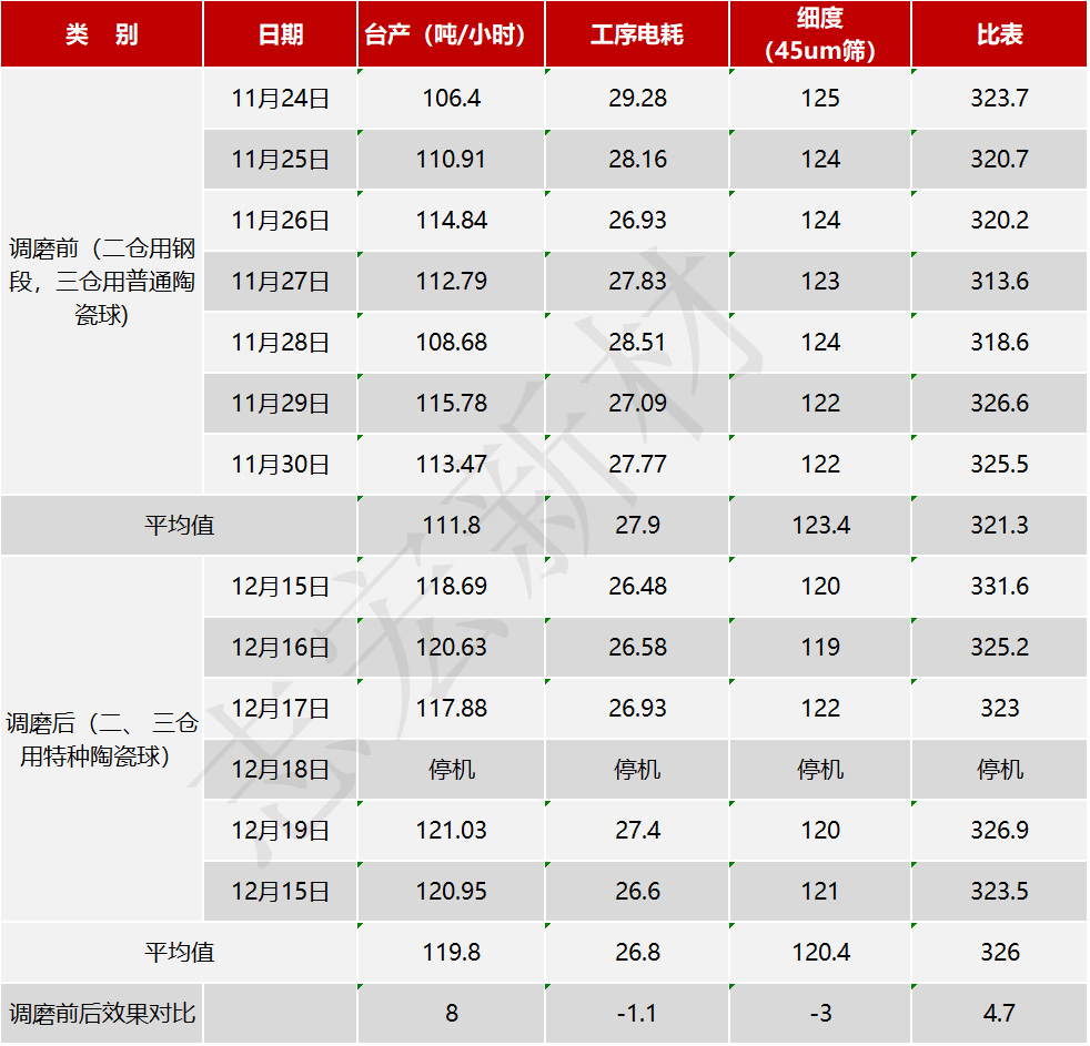 2#水泥磨粉磨工序調(diào)磨前后統(tǒng)計數(shù)據(jù)及對比