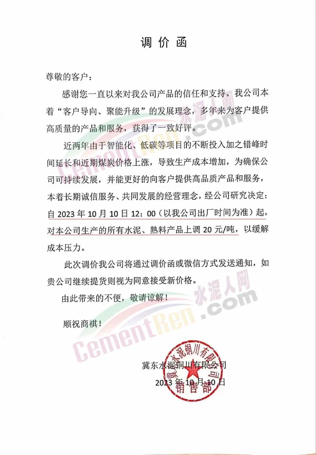 云南富源西南水泥有限公司通知,由于原煤價(jià)格上漲,造成生產(chǎn)成本增加,經(jīng)曲靖營銷中心經(jīng)營班子研究決定,自2023年10月10日零點(diǎn)各品種水泥上調(diào)20元/噸。