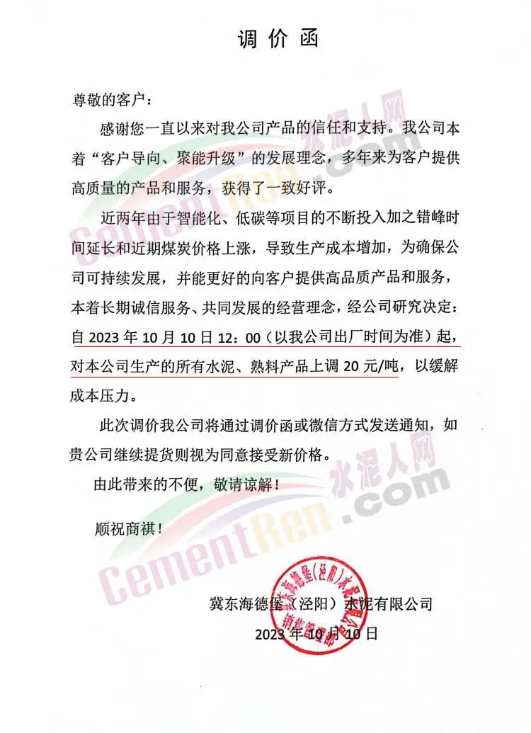 冀東水泥銅川有限公司、冀東海德堡(涇陽)水泥有限公司通知稱,近兩年由于智能化、低碳等項(xiàng)目的不斷投入加之錯(cuò)峰時(shí)間延長和近期煤炭價(jià)格上漲,導(dǎo)致生產(chǎn)成本增加,為確保公司可持續(xù)發(fā)展,并能更好地向客戶提供高品質(zhì)產(chǎn)品和服務(wù),本著長期誠信服務(wù)、共同發(fā)展的經(jīng)營理念,經(jīng)公司研究決定自2023年10月10日12時(shí)起,對(duì)本公司生產(chǎn)的所有水泥、熟料產(chǎn)品上調(diào)20元/噸,以緩解成本壓力。