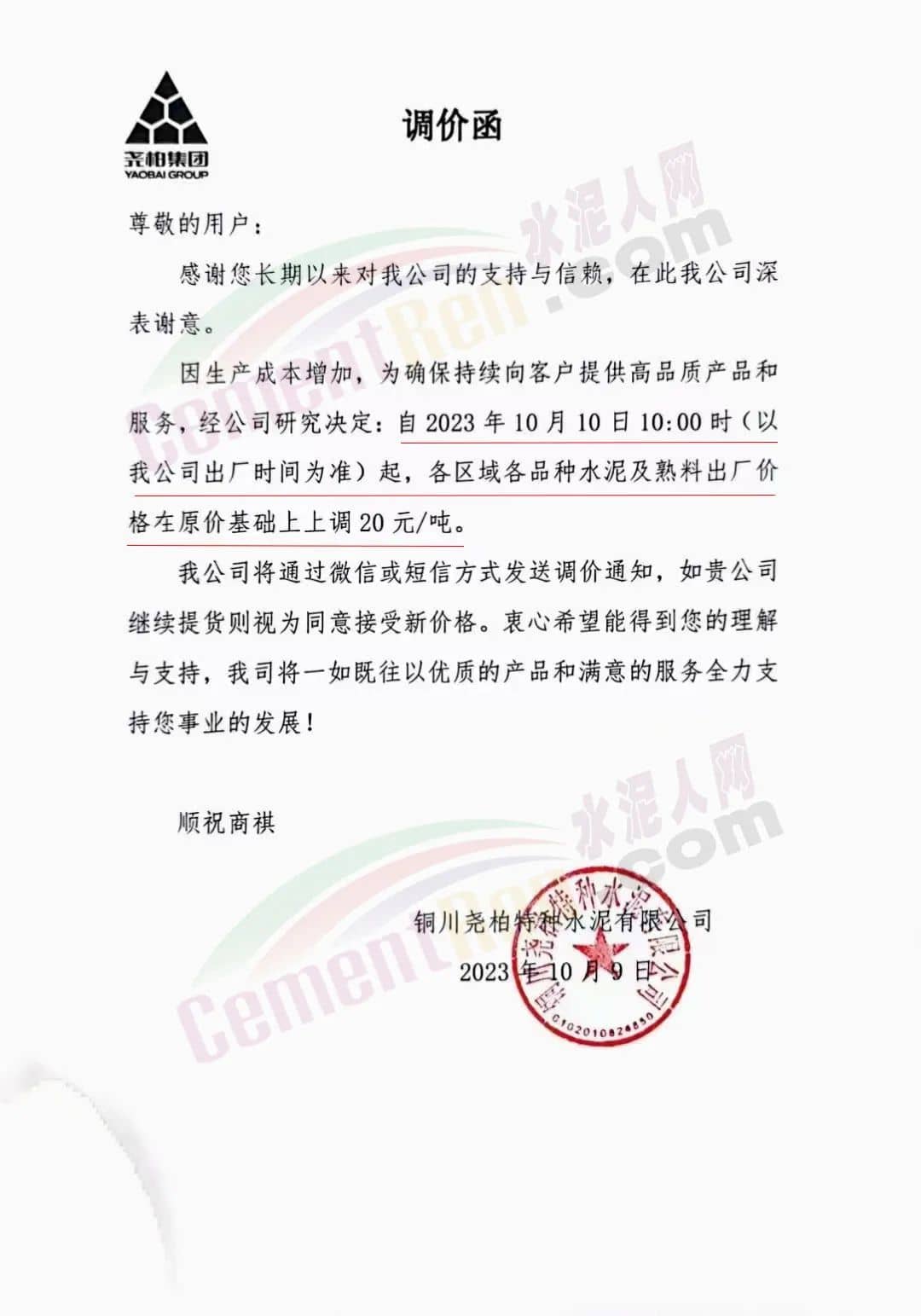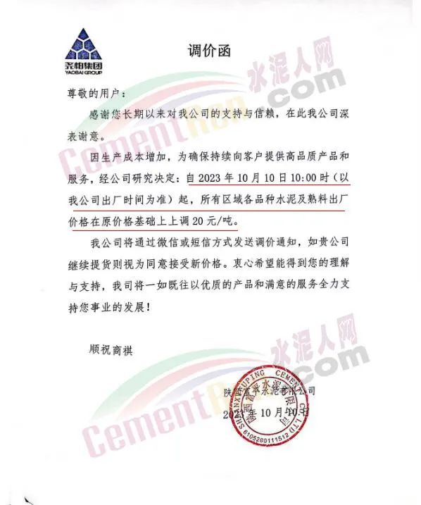 堯柏集團(tuán)旗下銅川堯柏特種水泥有限公司、陜西富平水泥有限公司通知,因生產(chǎn)成本增加,為確保持續(xù)向客戶提供高品質(zhì)產(chǎn)品和服務(wù),經(jīng)公司研究決定,自2023年10月10日10時(shí)起,所有區(qū)域各品種水泥及熟料出廠價(jià)格在原價(jià)格基礎(chǔ)上上調(diào)20元/噸。