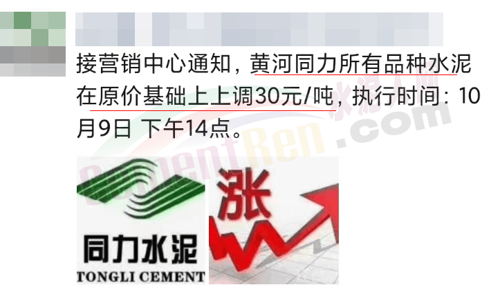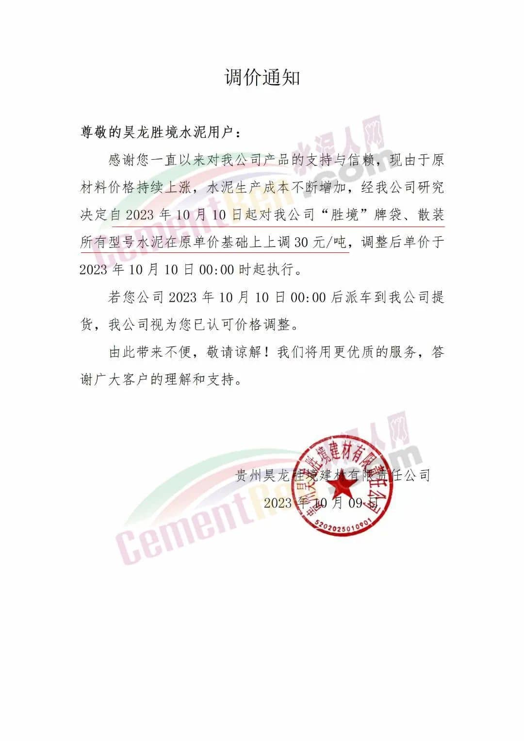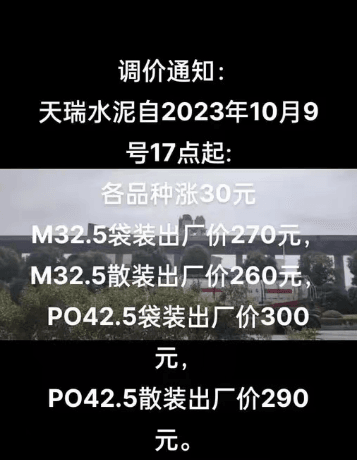 同日,貴州昊龍勝境建材有限責(zé)任公司通知,由于原材料價(jià)格持續(xù)上漲,水泥生產(chǎn)成本不斷增加,經(jīng)公司研究決定自2023年10月10日0時(shí)起對(duì)公司“勝境”牌袋、散裝所有型號(hào)水泥在原單價(jià)基礎(chǔ)上上調(diào)30元/噸。