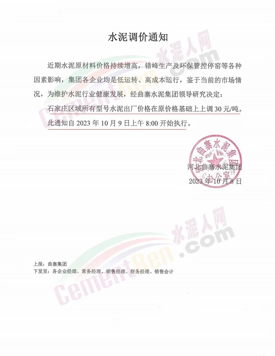 河北曲寨水泥集團(tuán)通知,近期水泥原材料價(jià)格持續(xù)增高,錯(cuò)峰生產(chǎn)及環(huán)保管控停窯等各種因素影響,集團(tuán)各企業(yè)均是低運(yùn)轉(zhuǎn)、高成本運(yùn)行,鑒于當(dāng)前的市場(chǎng)情況,為維護(hù)水泥行業(yè)健康發(fā)展,經(jīng)曲寨水泥集團(tuán)領(lǐng)導(dǎo)研究決定,自2023年10月9日上午8時(shí)起,石家莊區(qū)域所有型號(hào)水泥出廠價(jià)格在原價(jià)格基礎(chǔ)上上調(diào)30元/噸。