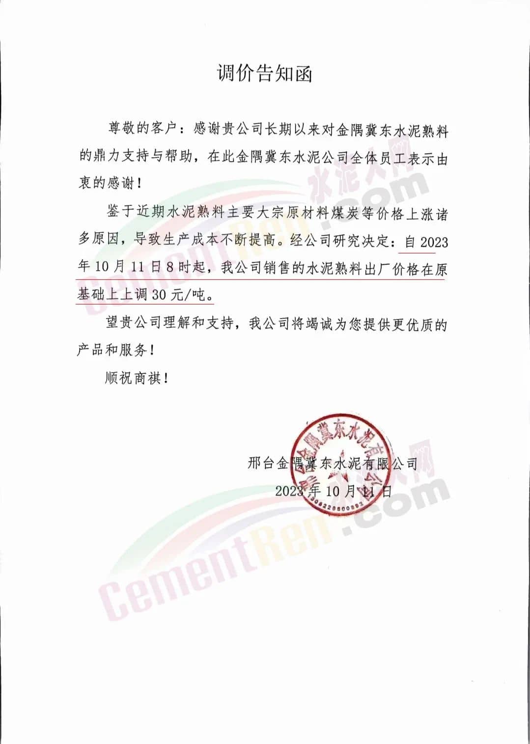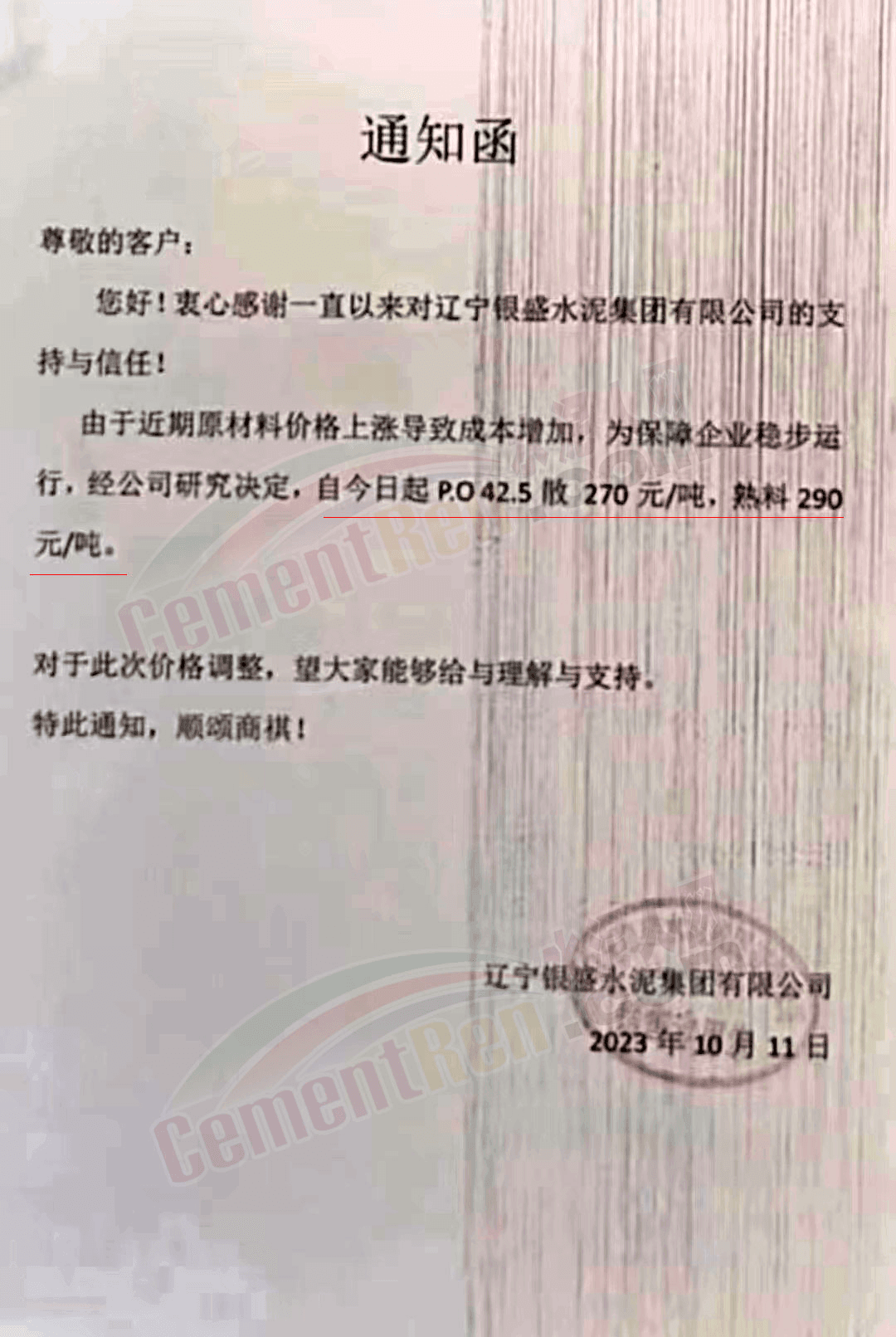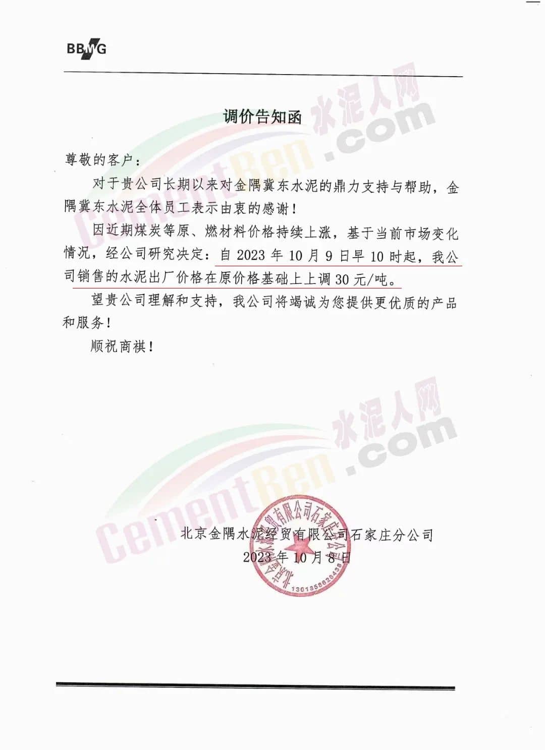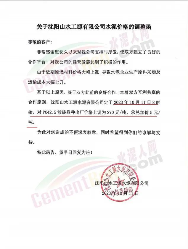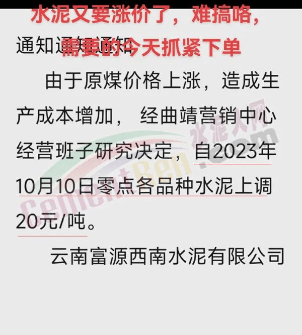 四川區(qū)域主要品牌水泥企業(yè)銷售經(jīng)理通知,將于12日起上調(diào)水泥報價50元/噸。