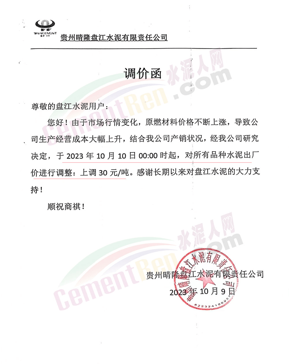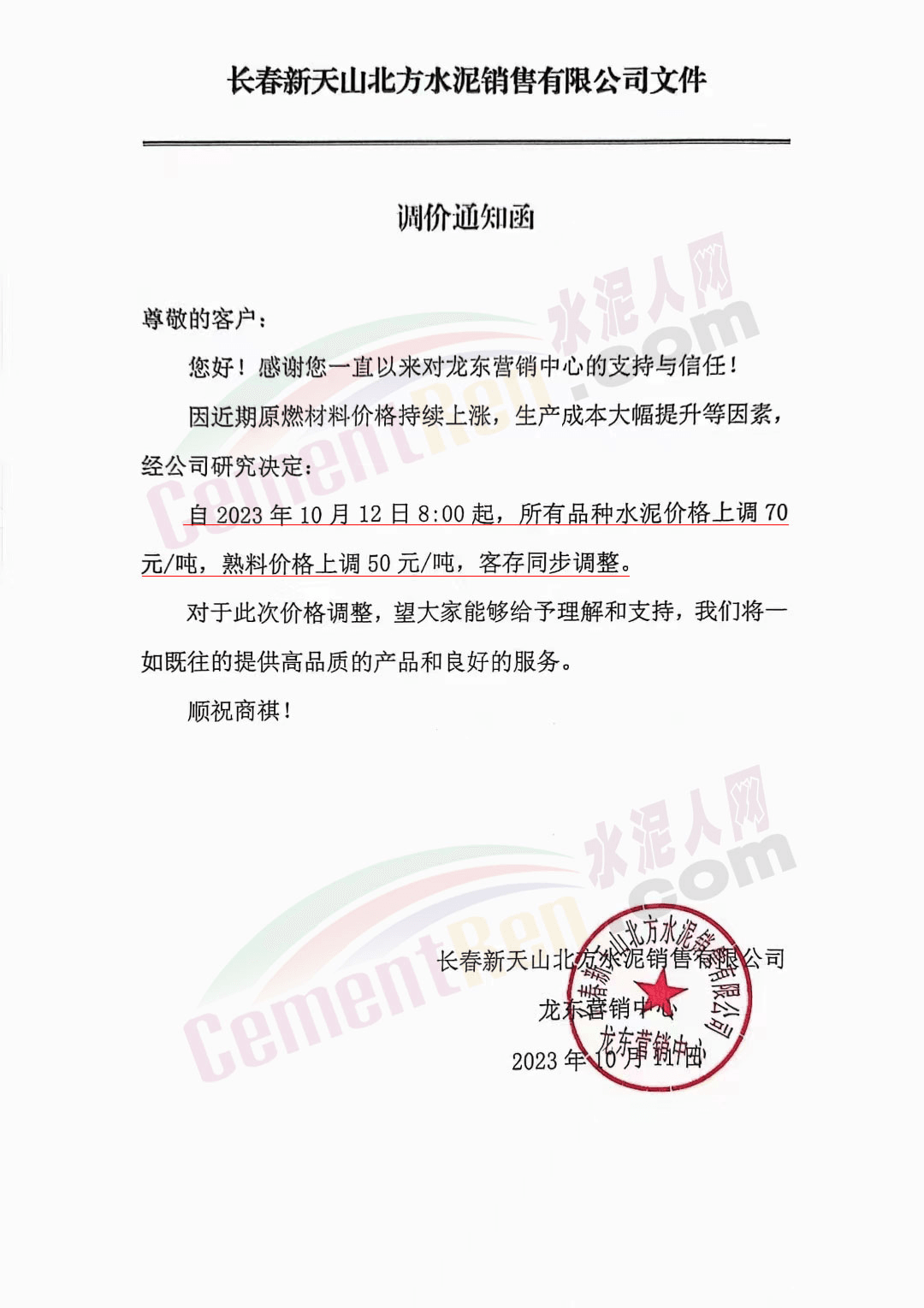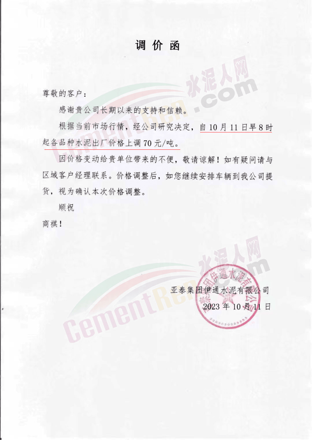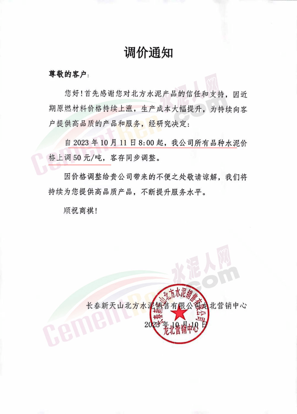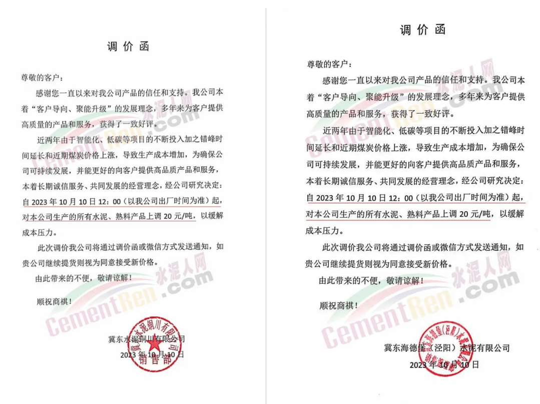 四川區(qū)域主要品牌水泥企業(yè)銷售經(jīng)理通知,將于12日起上調(diào)水泥報價50元/噸。
