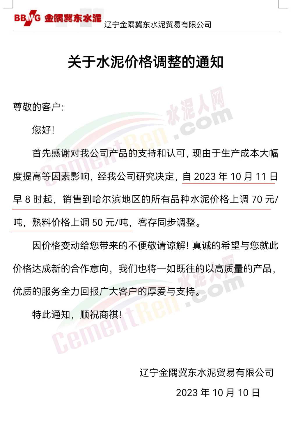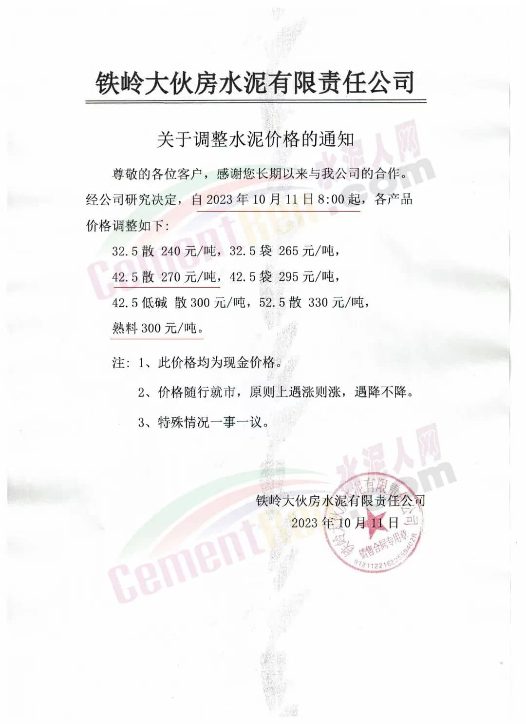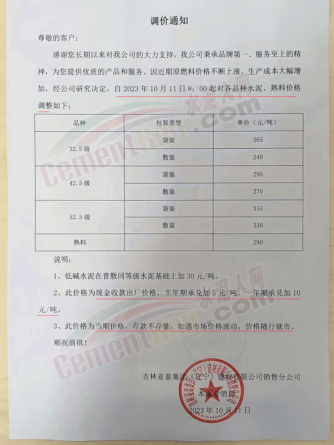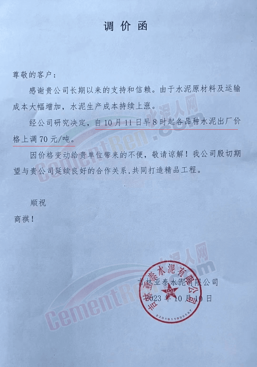 四川區(qū)域主要品牌水泥企業(yè)銷售經(jīng)理通知,將于12日起上調(diào)水泥報價50元/噸。