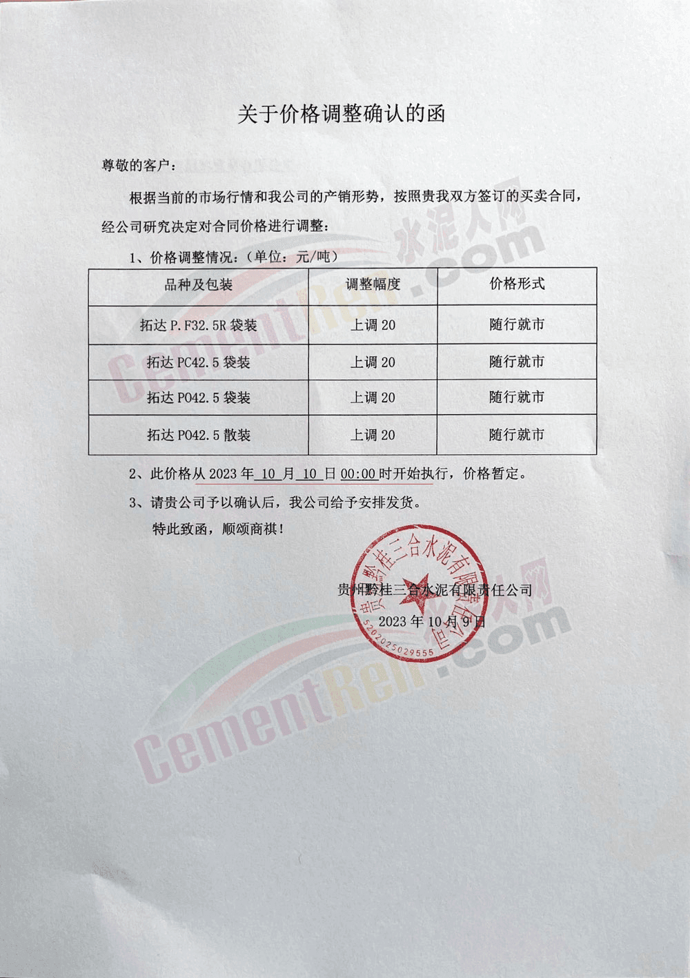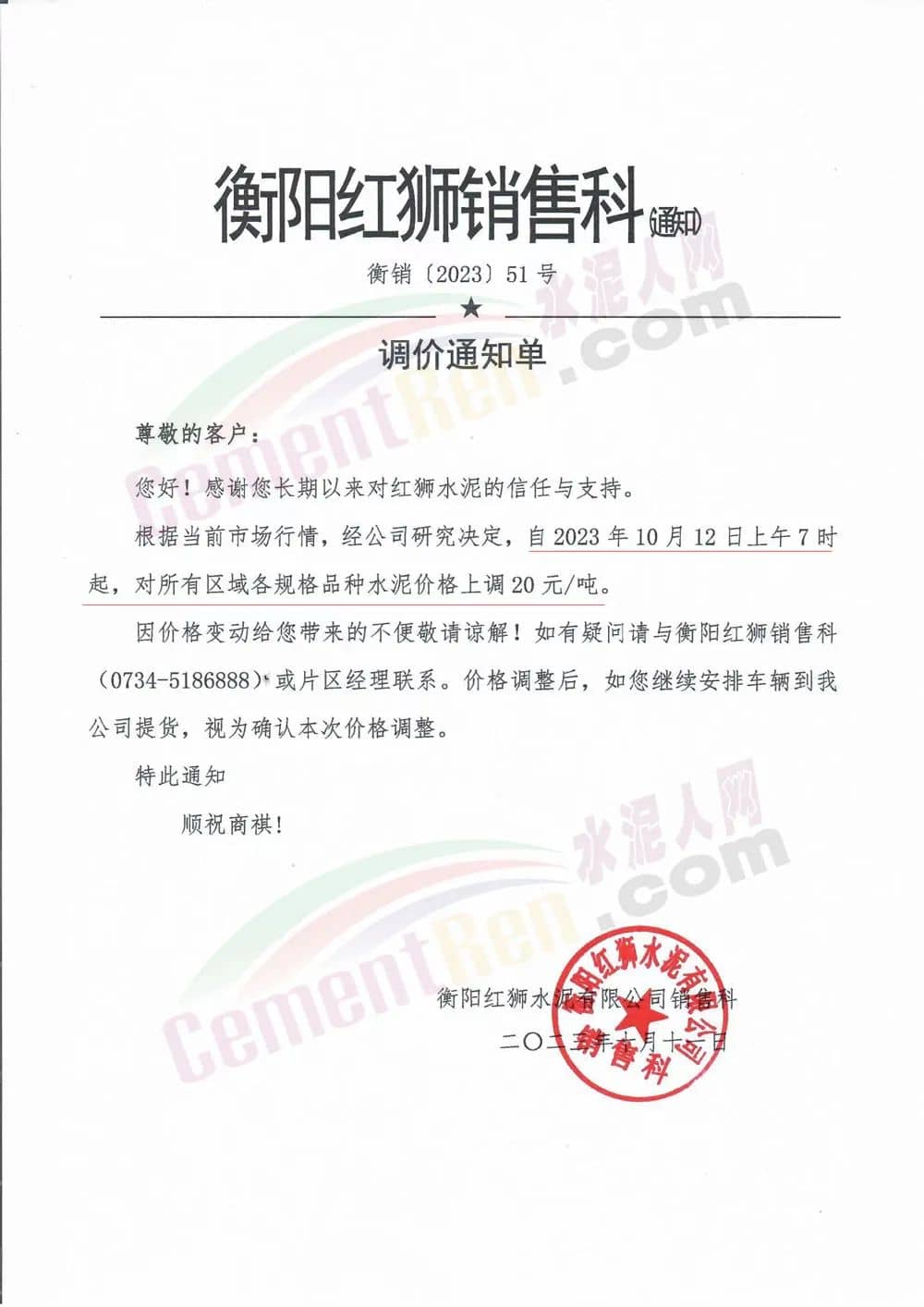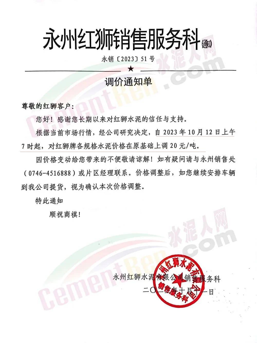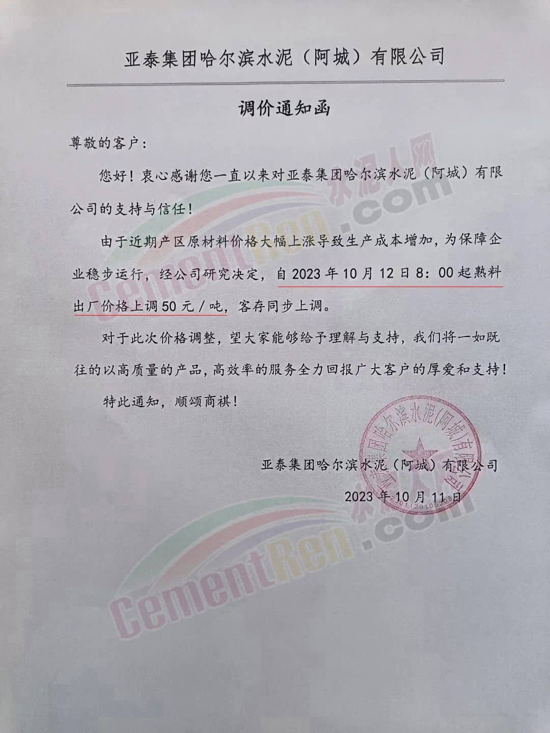 四川區(qū)域主要品牌水泥企業(yè)銷售經(jīng)理通知,將于12日起上調(diào)水泥報價50元/噸。