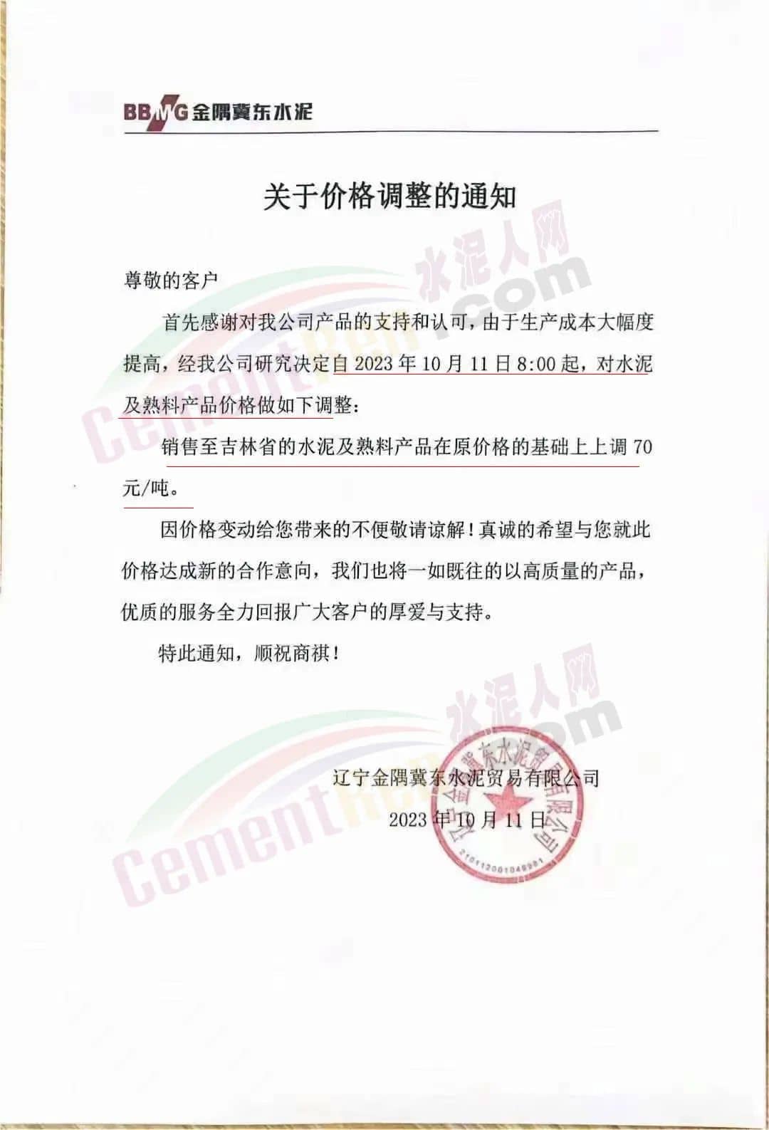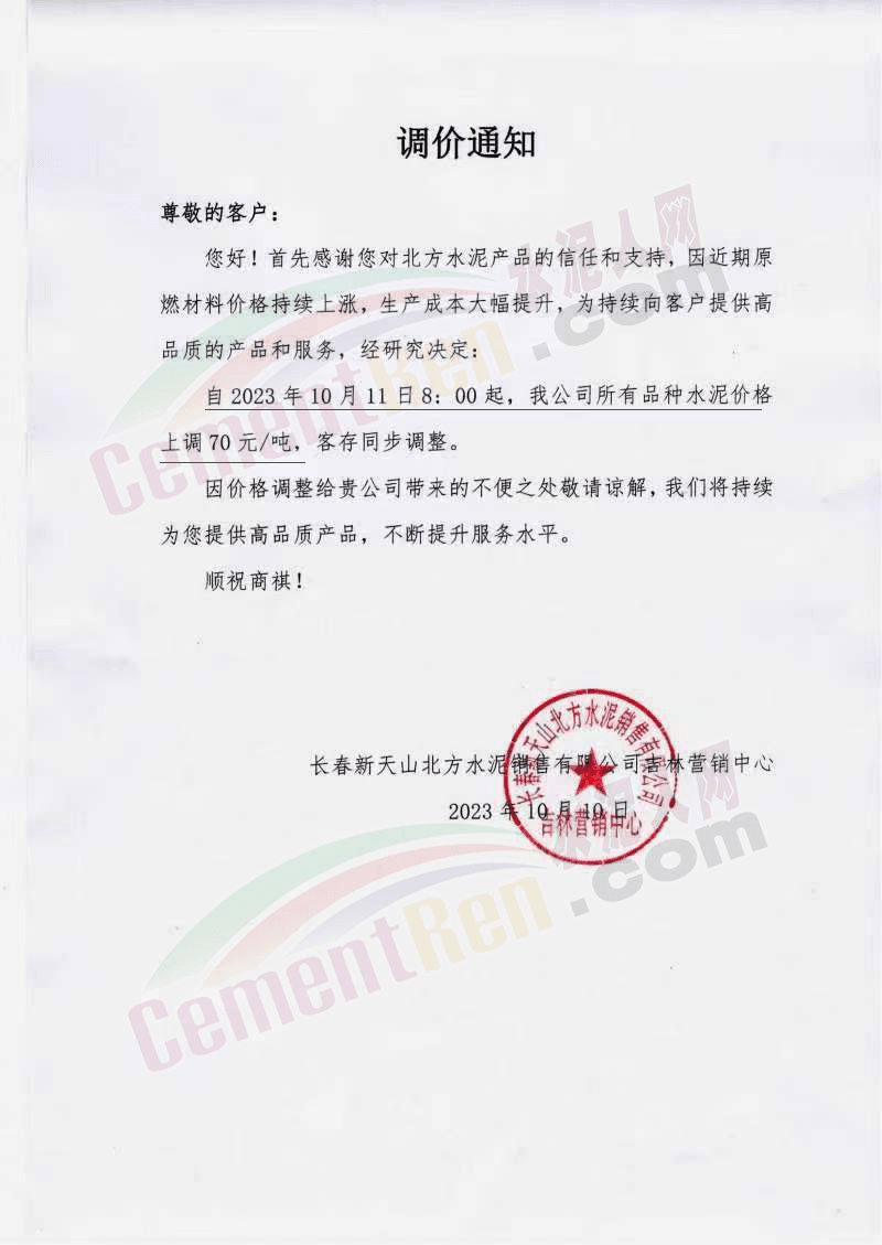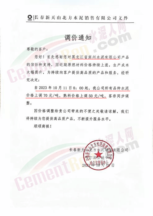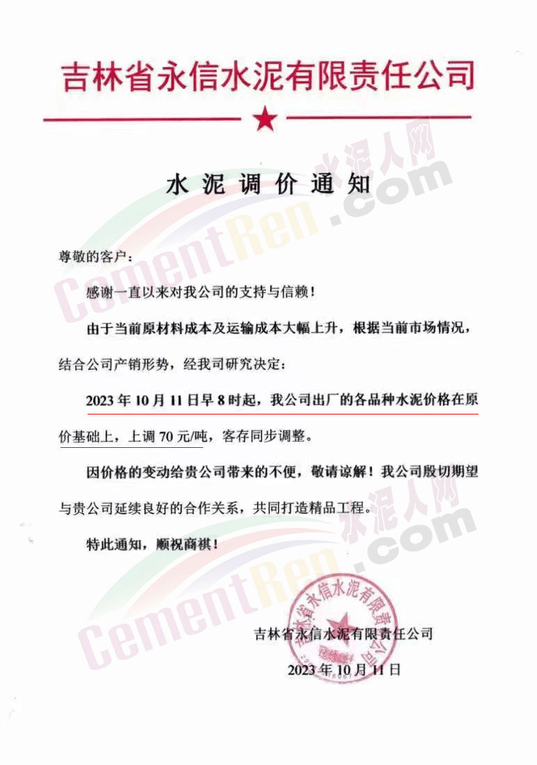 吉林區(qū)域,亞泰、北方、金隅冀東等企業(yè)通知上調(diào)水泥、熟料價格50-70元/噸。