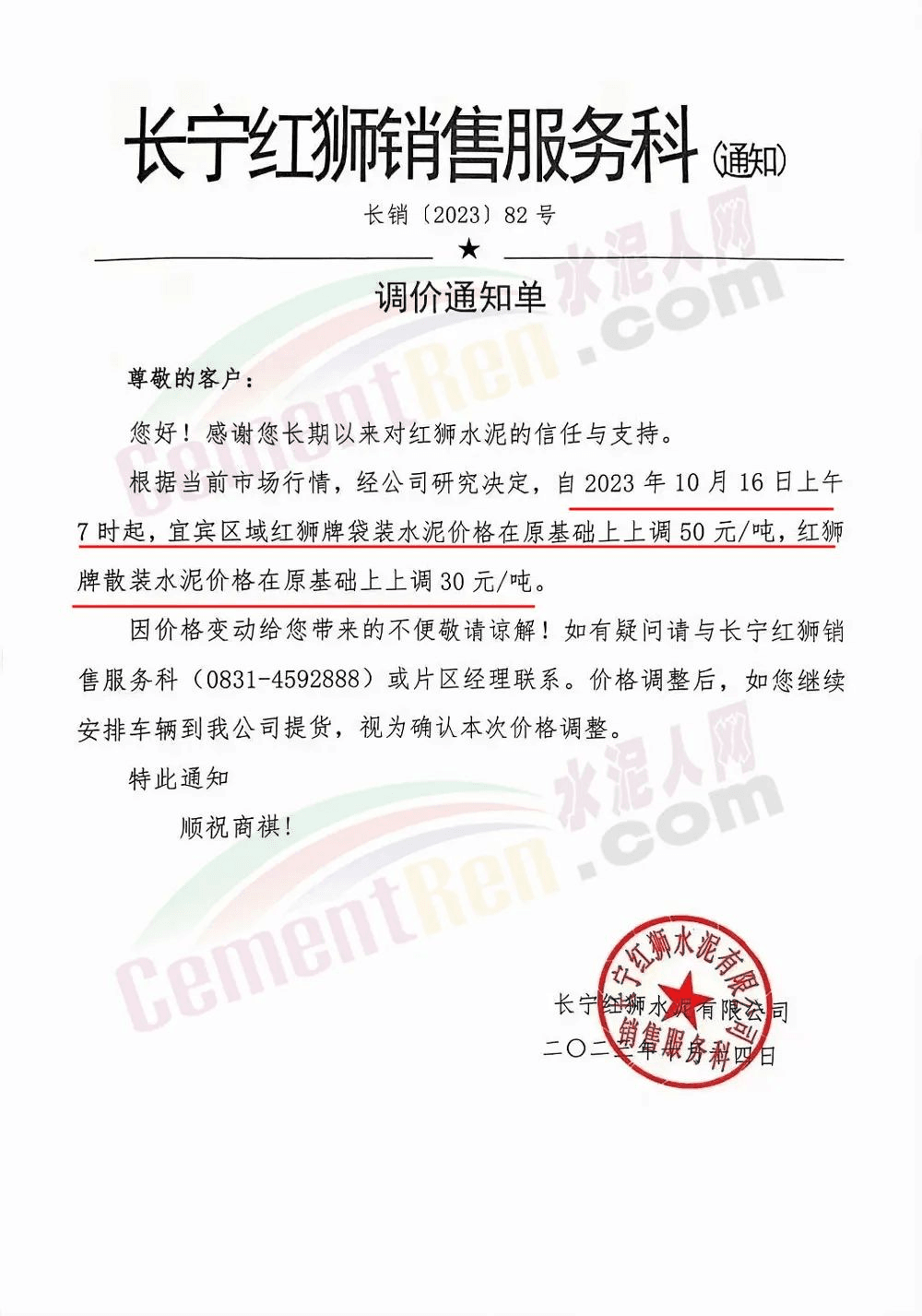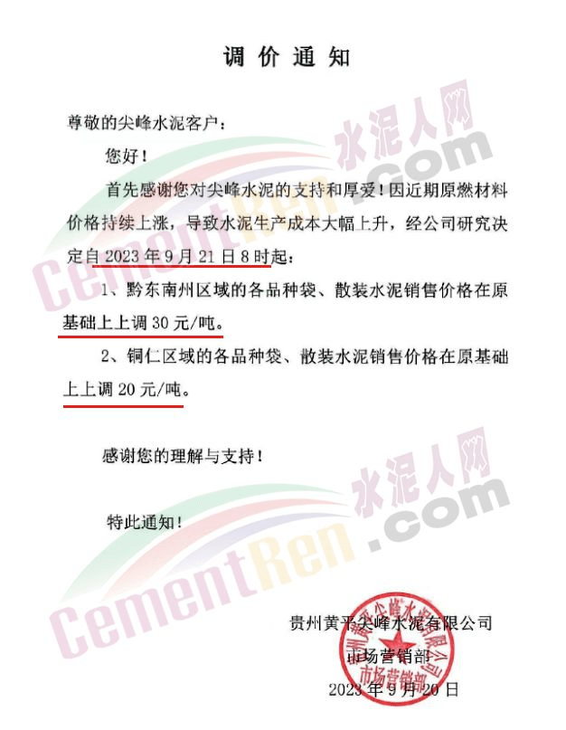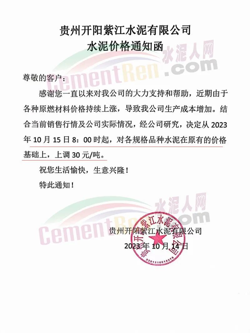 畢節(jié)賽德水泥有限公司通知,由于原材料價(jià)格持續(xù)上漲,導(dǎo)致公司生產(chǎn)成本增加,經(jīng)公司研究決定,自2023年10月16日零點(diǎn)起,對(duì)所有區(qū)域各品種水泥出廠價(jià)格在原有價(jià)格基礎(chǔ)上上調(diào)30元/噸。