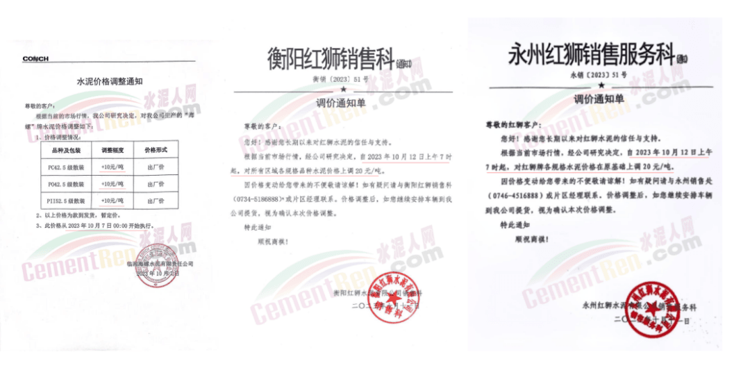 15日前后,貴州紅獅、西南、堯柏水泥等主要品牌企業(yè)通知上調(diào)水泥報(bào)價(jià)30元/噸。龍里紅獅銷售服務(wù)科通知,自2023年10月15日上午7時(shí)起,對(duì)紅獅牌、錢江牌各規(guī)格水泥合同價(jià)上調(diào)30元/噸。