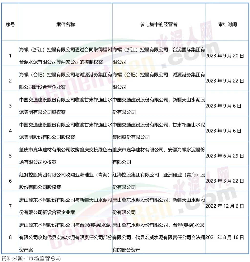 近幾年來,市場監(jiān)管總局公布了多起《無條件批準(zhǔn)經(jīng)營者集中案》其中涉及水泥行業(yè)頭部企業(yè)天山水泥、海螺水泥、冀東水泥、臺泥水泥、紅獅水泥、祁連山水泥共8例。