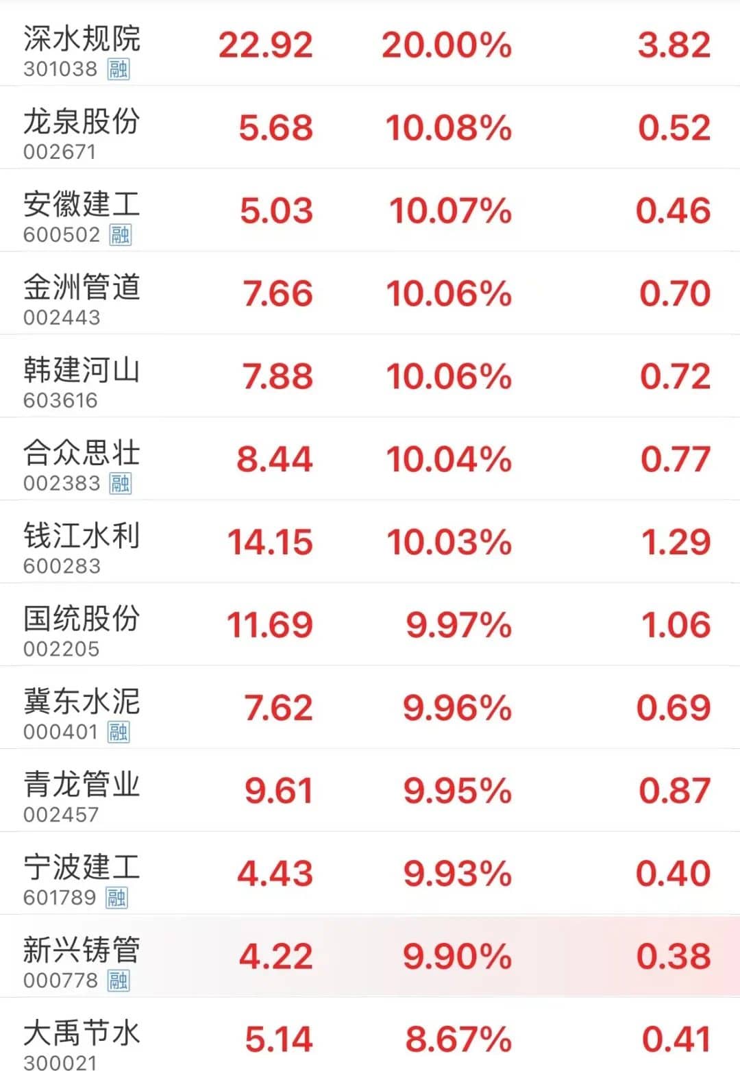 受增發(fā)1萬億元國債利好提振,A股聞“基”起舞,水利、水泥制造、基建、工程器械、鋼鐵、建筑等大基建產(chǎn)業(yè)鏈全線暴漲。 水利板塊中,深水規(guī)院以20%幅度漲停,龍泉股份、安徽建工、金洲管道、韓建河山、合眾思壯、錢江水利、國統(tǒng)股份、冀東水泥、青龍管業(yè)等10余只個股漲停。