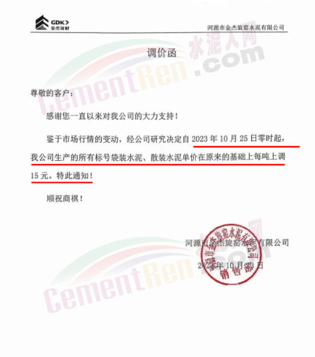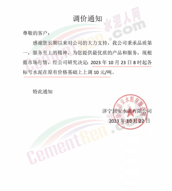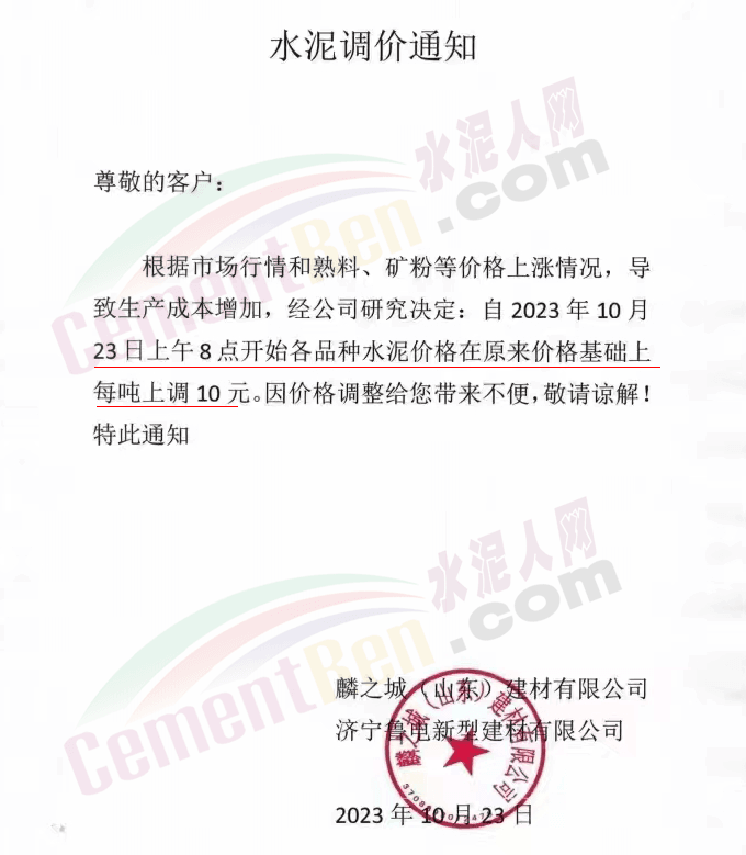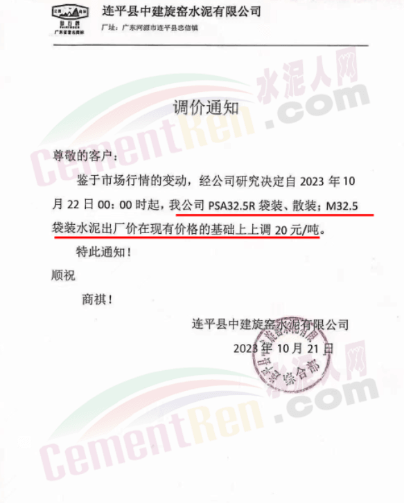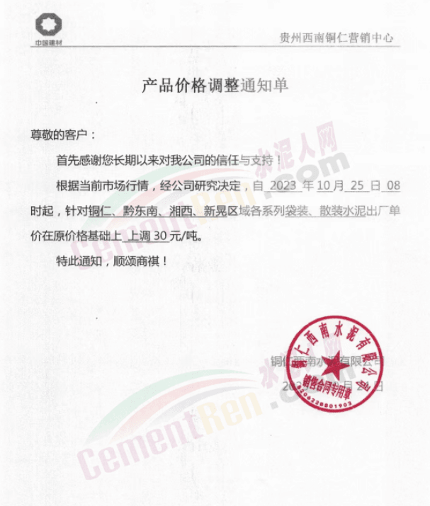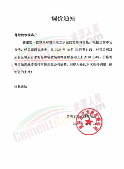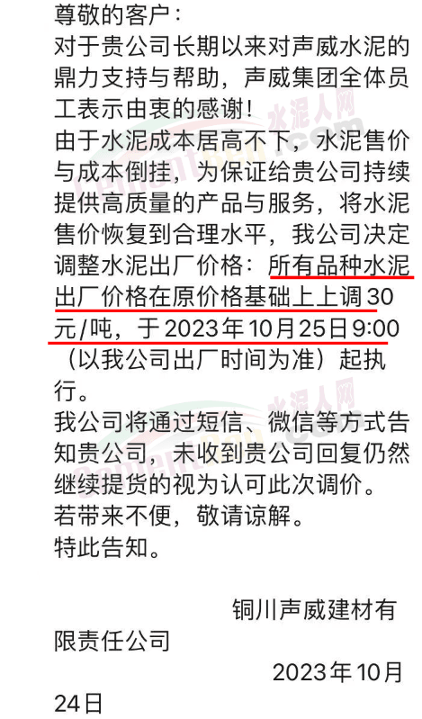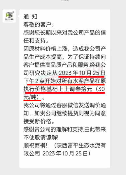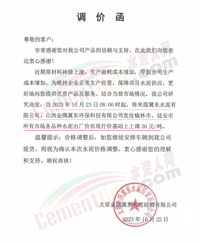 金隅冀東經(jīng)貿(mào)公司通知,由于近期原材料持續(xù)上漲,生產(chǎn)能耗成本增加,導(dǎo)致公司生產(chǎn)成本增加。為維持企業(yè)正常生產(chǎn)經(jīng)營,保障項目水泥供應(yīng),經(jīng)研究決定自2023年10月23日8時起,將米脂冀東水泥有限公司、山西金隅冀東環(huán)??萍加邢薰景l(fā)往榆林市、延安市所有市場各品種水泥出廠價上調(diào)30元/噸。