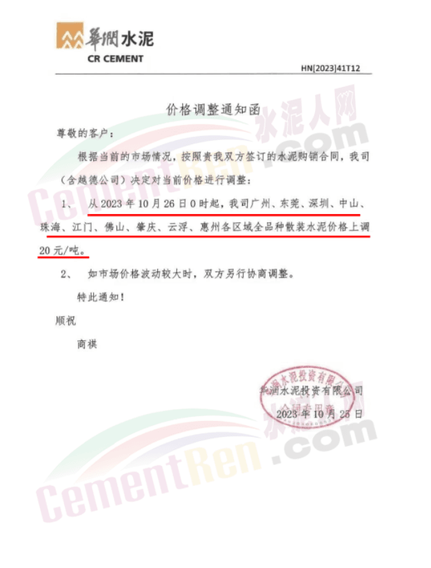 廣東珠三角及周邊區(qū)域中材、華潤、塔牌、光大、臺泥等多家主要品牌企業(yè)通知自10月26日起上調(diào)水泥報價15~20元/噸。