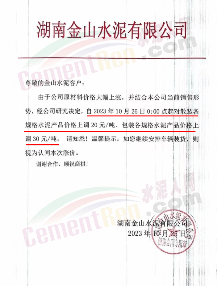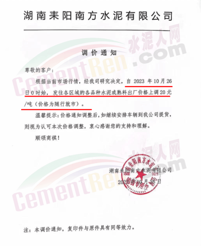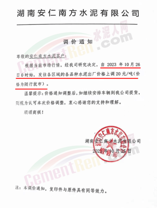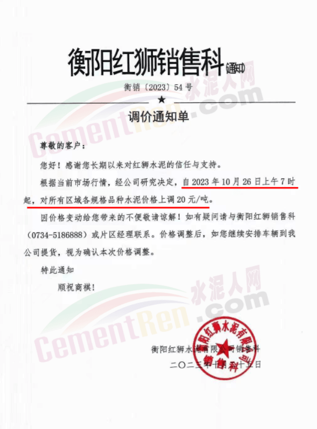 湖南耒陽南方、安仁南方、衡陽紅獅、永州紅獅、金山水泥等通知,自10月26日起上調(diào)水泥和熟料報價20元/噸。