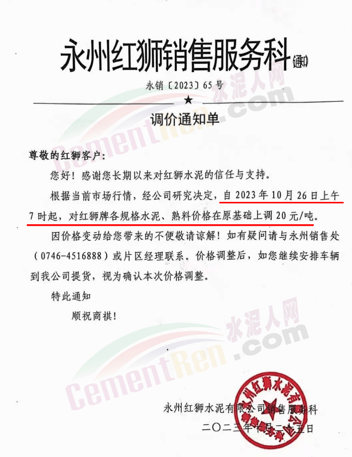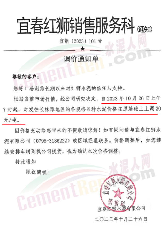 宜春紅獅通知,自10月26日起,對發(fā)往湖南長株潭地區(qū)的各規(guī)格品種水泥報價上調(diào)20元/噸。