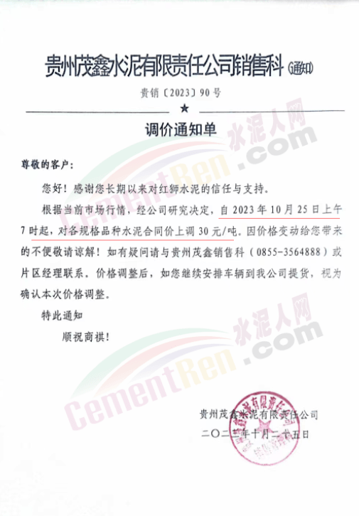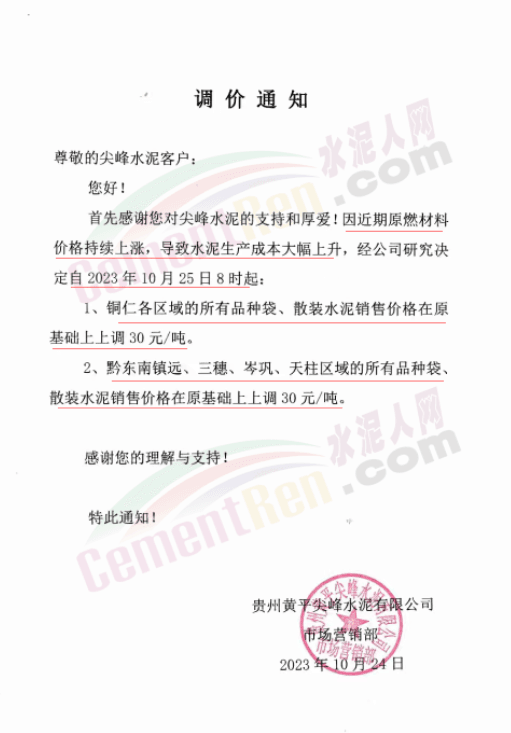 貴州銅仁、黔東南等區(qū)域茂鑫紅獅、黃平尖峰、銅仁西南、貴州東立等多家主要品牌水泥企業(yè)再次通知上調(diào)水泥報價30元/噸。企業(yè)調(diào)價通知稱,因近期原燃材料價格持續(xù)上漲,導(dǎo)致水泥生產(chǎn)成本大幅上升,經(jīng)公司研究決定自10月25日起各品種水泥價格上調(diào)30元/噸。