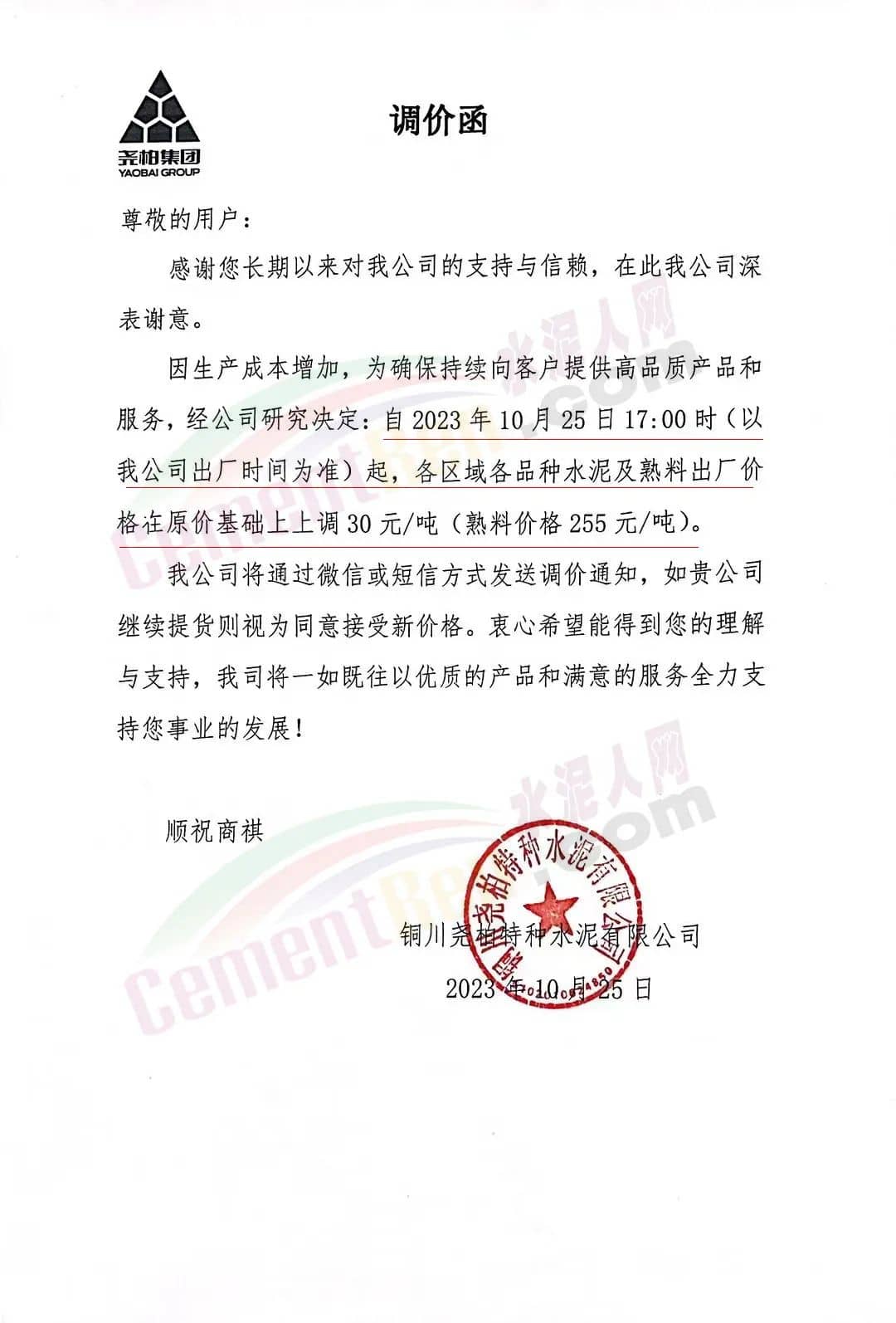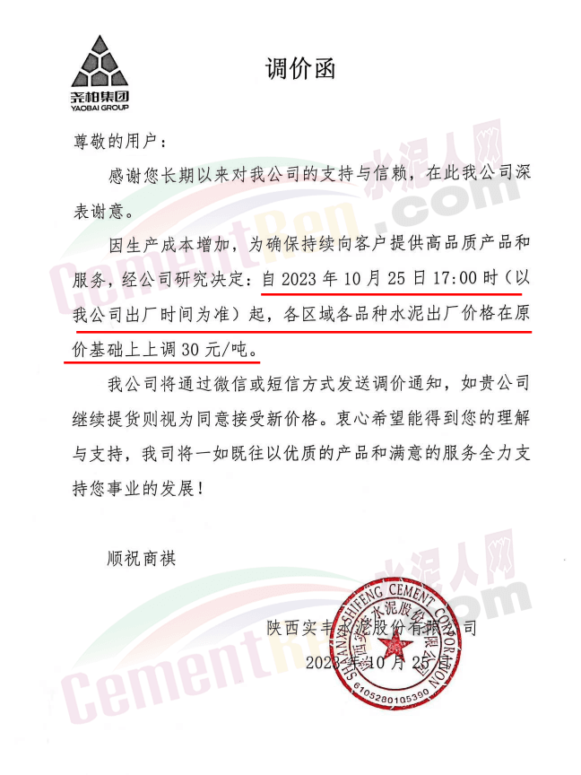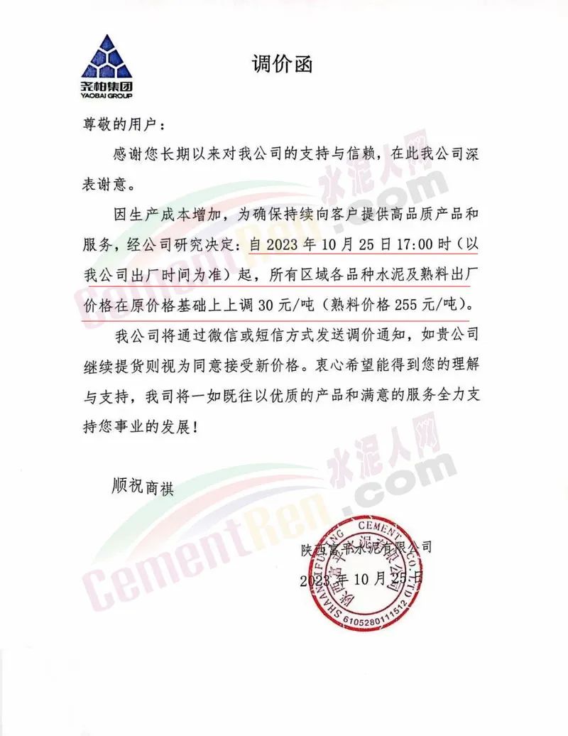 陜西銅川堯柏水泥、富平水泥、蒲城堯柏、實豐水泥、富平生態(tài)水泥、銅川聲威建材等主要品牌企業(yè)通知,因生產(chǎn)成本增加,自10月25日起各區(qū)域各品種水泥及熟料出廠價上調(diào)30元/噸(熟料價格255元/噸)。
