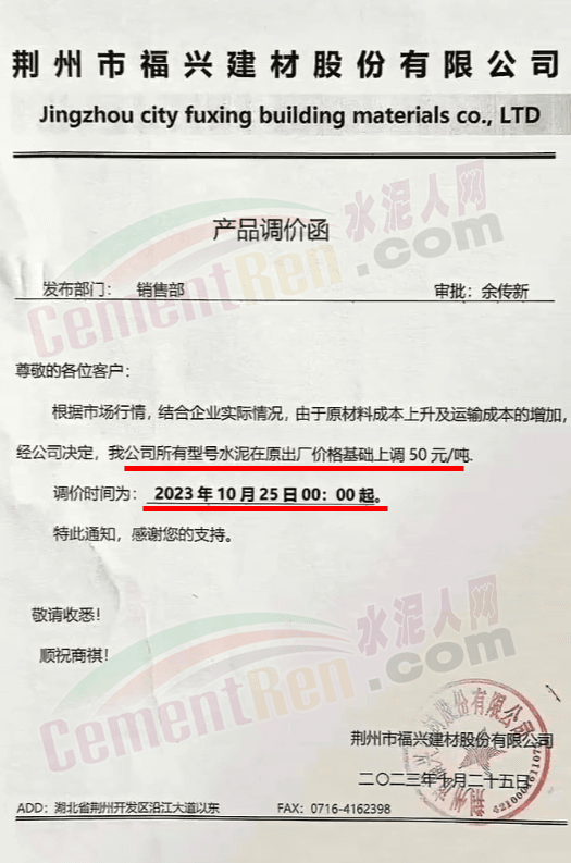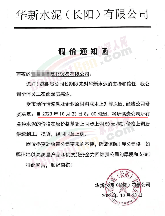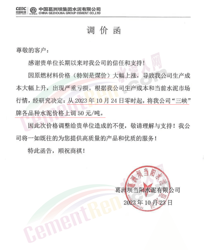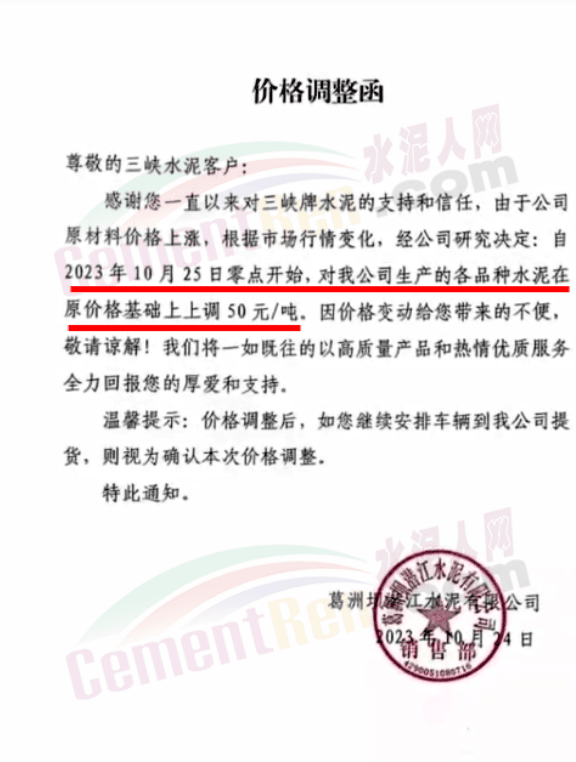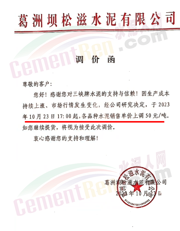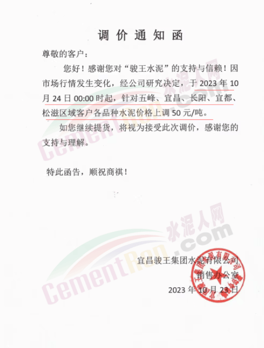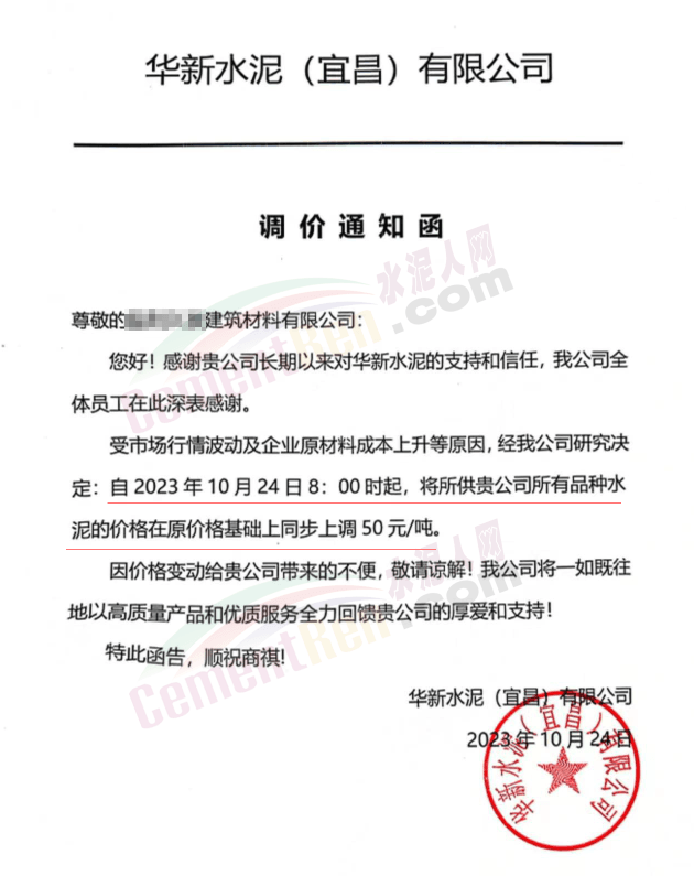 湖北華新水泥、葛洲壩水泥、駿王水泥等通知上調(diào)水泥報價50元/噸。