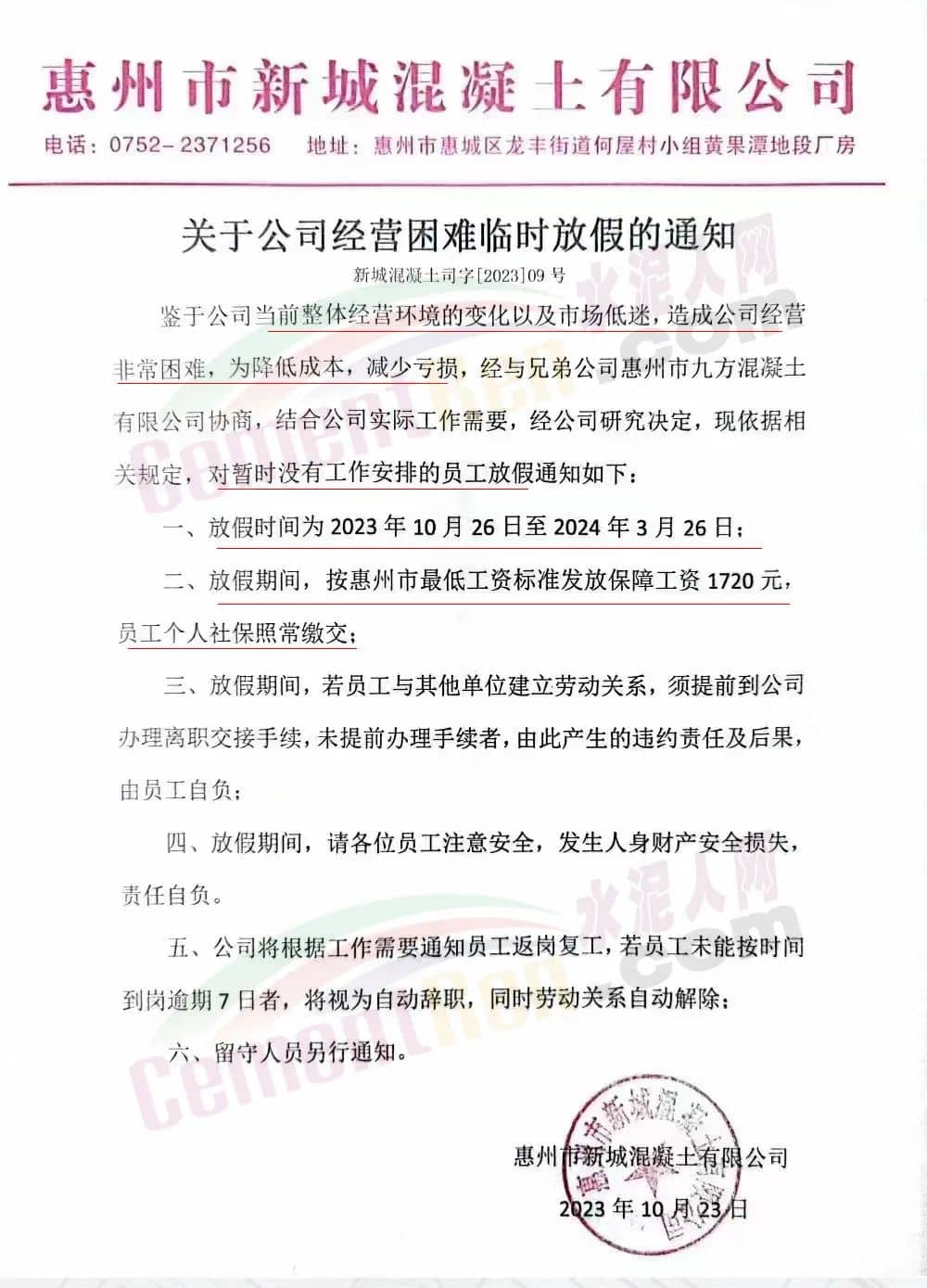 日前,廣東惠州市新城混凝土有限公司發(fā)布《關(guān)于公司經(jīng)營困難臨時放假的通知》稱,鑒于公司當(dāng)前整體經(jīng)營環(huán)境的變化以及市場低迷,造成公司經(jīng)營非常困難,為降低成本,減少虧損,經(jīng)與兄弟公司惠州市九方混凝土有限公司協(xié)商,結(jié)合公司實際工作需要,對暫時沒有工作安排的員工從2023年10月26日至2024年3月26日放假。放假期間,按惠州市最低工資標(biāo)準發(fā)放保障工資1720元,員工個人社保照常繳交。