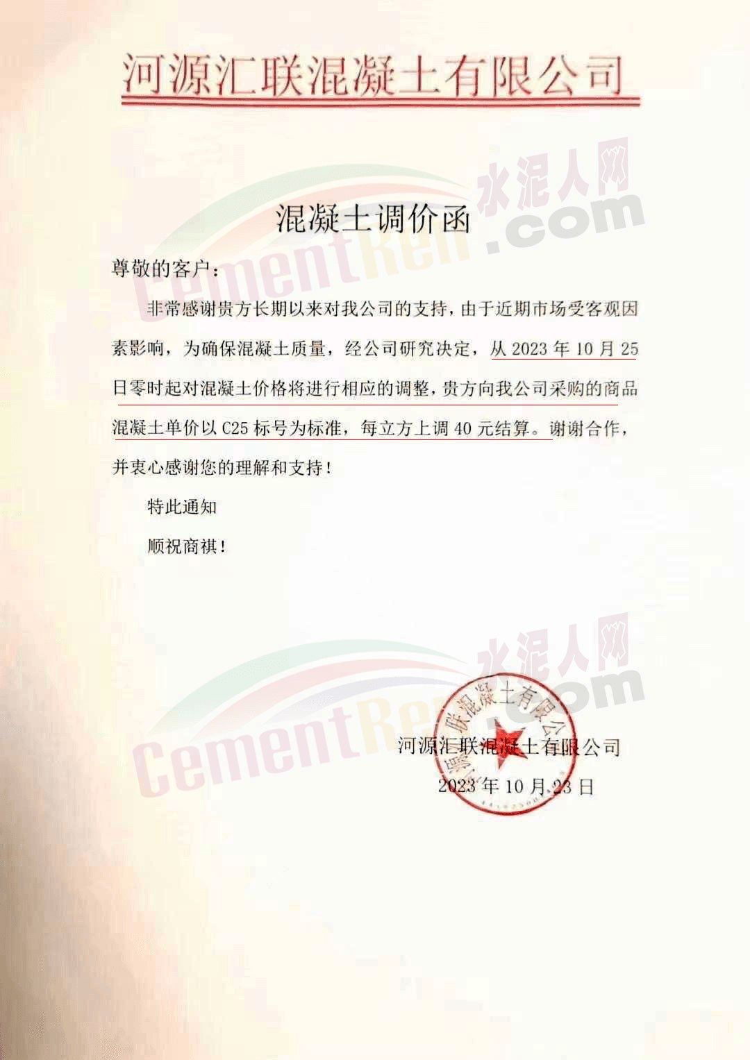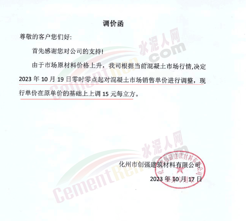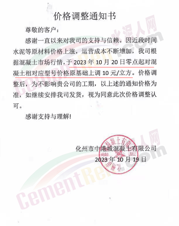 同期,河源一家商混企業(yè)一次性上調(diào)報價40元/噸。企業(yè)調(diào)價通知稱,由于近期市場受客觀因素影響,為確保混凝土質(zhì)量,經(jīng)公司研究決定從10月25日零時起上調(diào)混凝土報價。