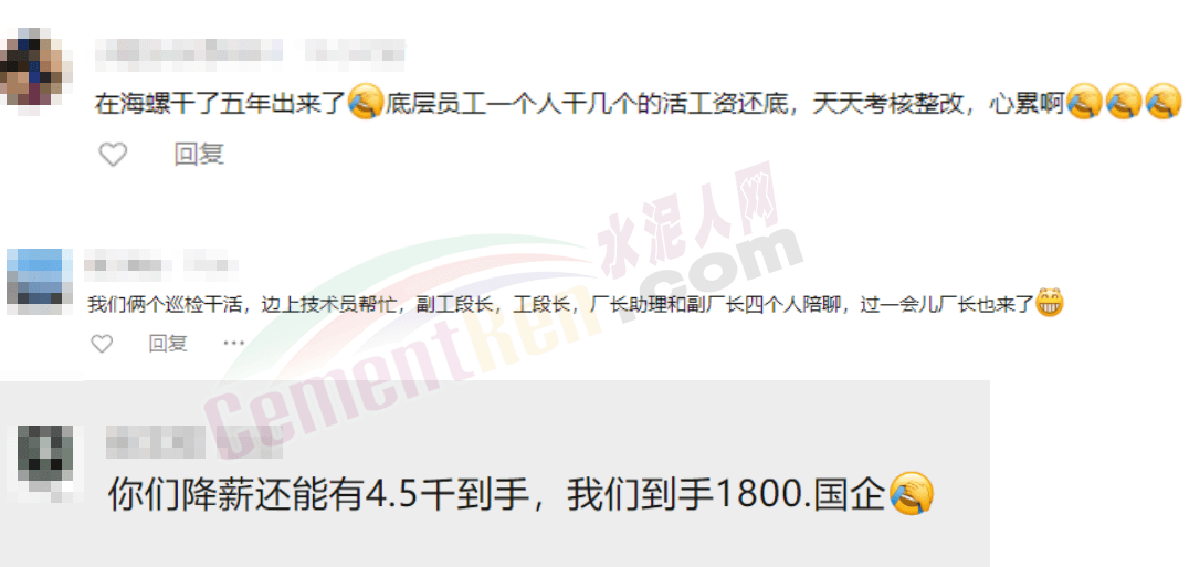 安徽某大型水泥廠員工表示,一個月五場考試,80分及格,其中兩場不及格就是待崗。2023年的月薪本就不如2000年的高,還動不動被考核,一線職工一個月到手才3000多。另一家福建國企員工表示,到手只有1800元……