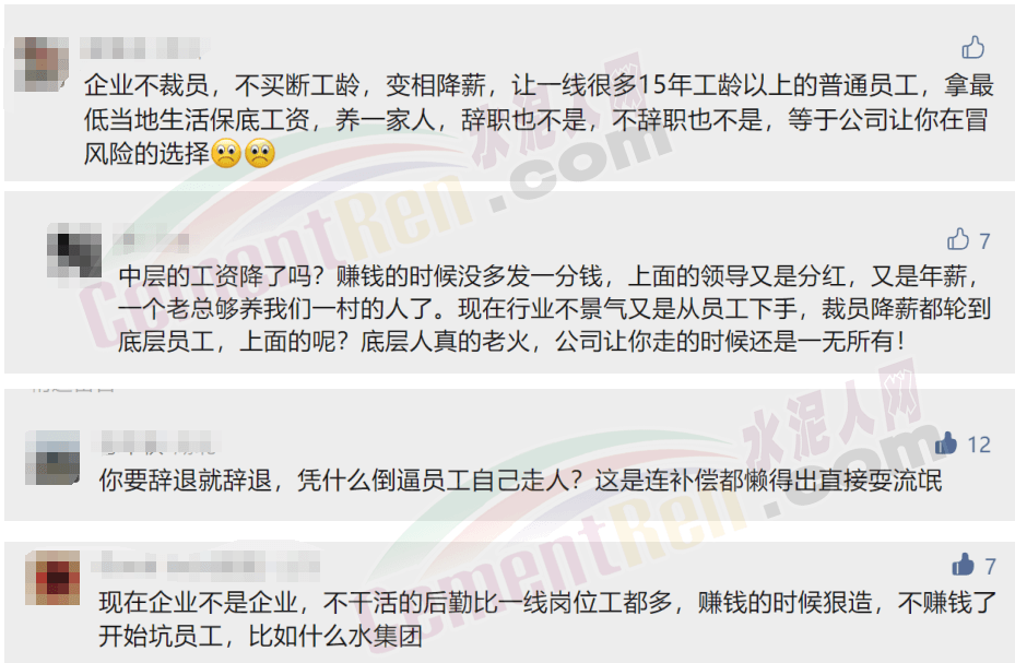 降薪、考核,取消各類獎金、福利、補貼已經(jīng)不只是個別企業(yè),而是大多數(shù)企業(yè)的普遍做法了。不僅如此,如塔牌水泥,關閉兩家粉磨站出清低效產能,員工全部解除合同在水泥行業(yè)也不在少數(shù)。每天都有水泥企業(yè)生產線、設備、股權登上拍賣平臺,也意味著每天都有一眾水泥人解除合同失去工作或正在失去工作的路上。