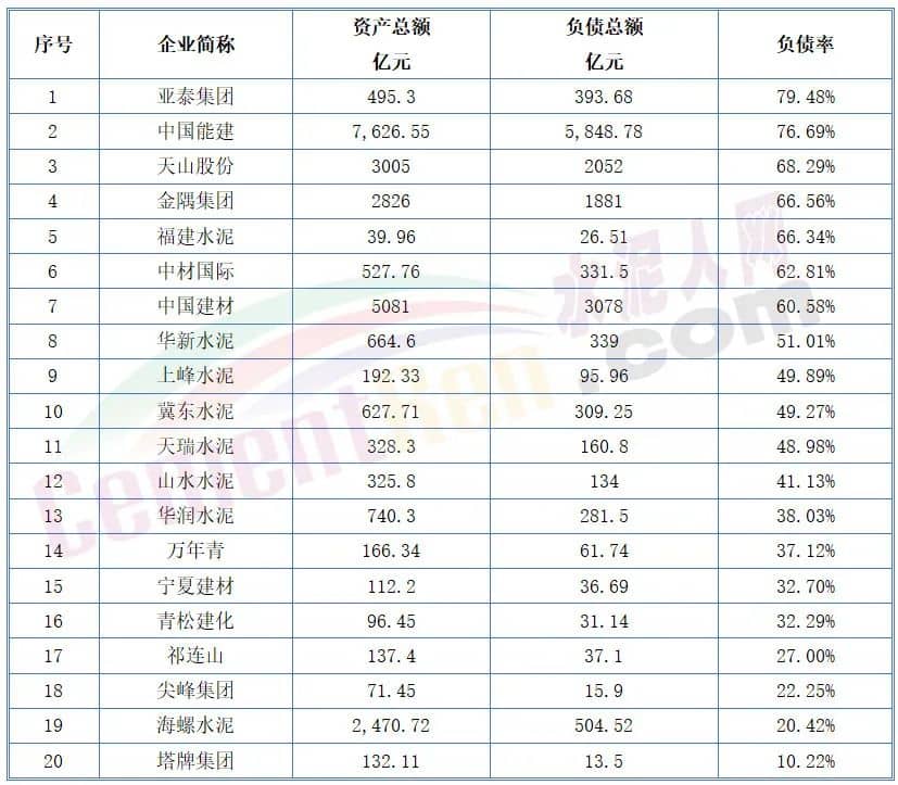近期水泥行業(yè)各大上市公司先后發(fā)布了今年前三季度業(yè)績(jī)報(bào)告。其中亞泰集團(tuán)、中國(guó)能建、天山股份、金隅集團(tuán)、福建水泥、中材國(guó)際、中國(guó)建材等負(fù)債率超過(guò)50%。