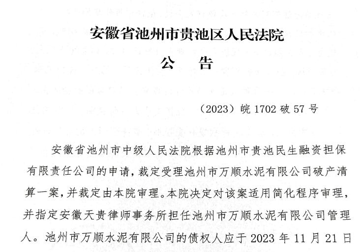 10月19日,安徽省池州市貴池區(qū)人民法院公告稱(chēng),安徽省池州市中級(jí)人民法院根據(jù)池州市貴池民生融資擔(dān)保有限責(zé)任公司的申請(qǐng),裁定受理池州市萬(wàn)順?biāo)嘤邢薰酒飘a(chǎn)清算一案。