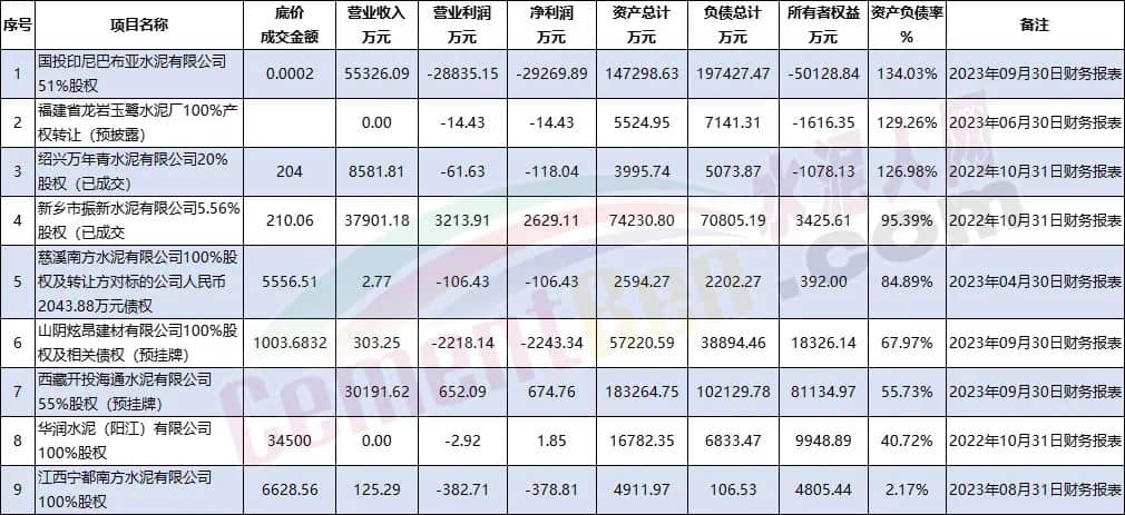 除已宣告破產(chǎn)的企業(yè)外,另有部分企業(yè)公開(kāi)出讓股權(quán)。其披露信息顯示,資產(chǎn)負(fù)債率達(dá)100%以上。其中,國(guó)投印尼巴布亞水泥有限公司2023年09月30日財(cái)務(wù)報(bào)表顯示,資產(chǎn)負(fù)債率達(dá)134.03%。海螺水泥持股比例達(dá)49%,為其第二大股東。企業(yè)負(fù)債總計(jì)達(dá)19.74億,所有者權(quán)益為-5.01億,51%股權(quán)以2元底價(jià)出售。