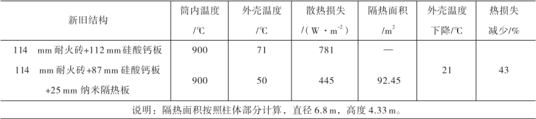采用納米隔熱板替換原硅酸鈣板一段時(shí)間后發(fā)現(xiàn),C5旋風(fēng)筒散熱損失減少336W/m2,外殼溫度下降21℃,熱損失減少43%,加強(qiáng)耐火襯的隔熱效果。