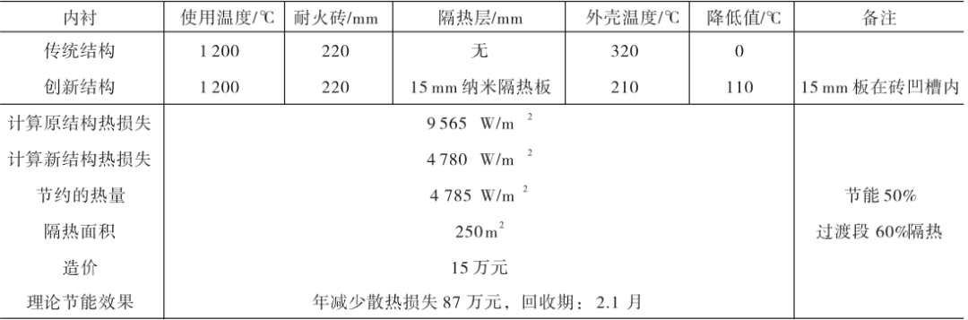 該生產(chǎn)線應(yīng)用15 mmWDS納米隔熱板點(diǎn)火投產(chǎn)10天后,在回轉(zhuǎn)窯正常生產(chǎn)中,回轉(zhuǎn)窯外殼溫度掃描35~63 m處全是綠色的低溫區(qū)域,兩個(gè)銜接的區(qū)域之間沒有一點(diǎn)過渡顏色,充分體現(xiàn)了凹槽磚復(fù)合納米隔熱板的隔熱效果,相比傳統(tǒng)隔熱方法筒體表面溫度下降110 ℃,散熱損失減少4785W/m2,年減少散熱損失87萬元,約2月左右即可收回投資。